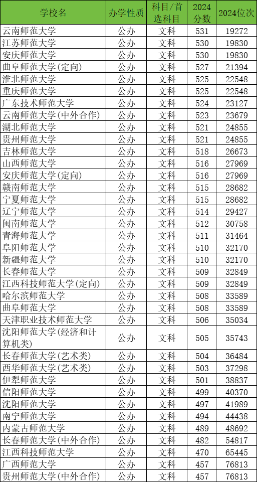 下面是录取分数线最低的文科二本师范大学名单一览表: