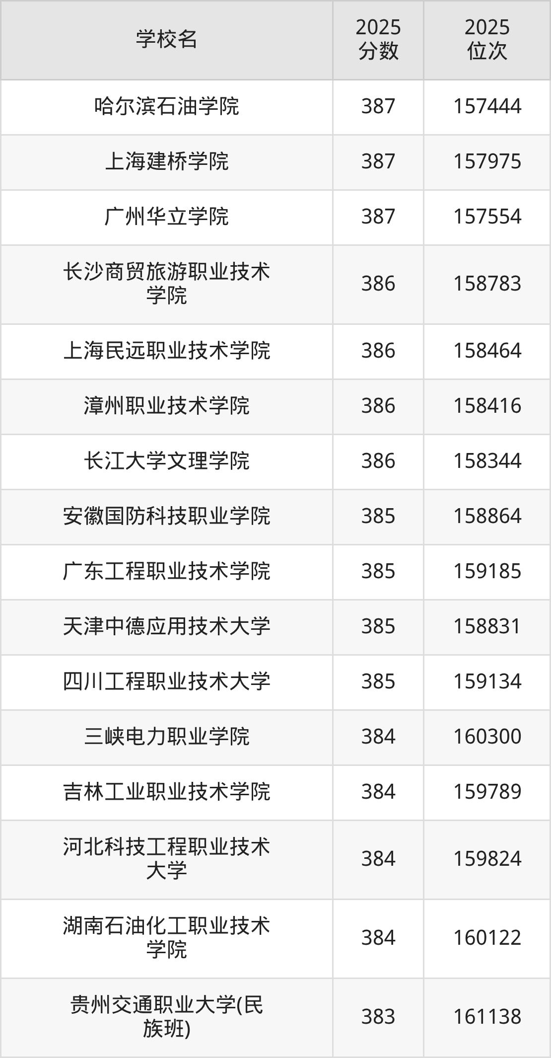 | 贵阳职业技术学院(民 族班) | 382 | 69853 |
