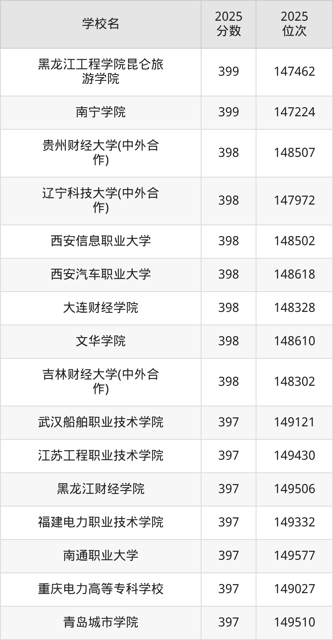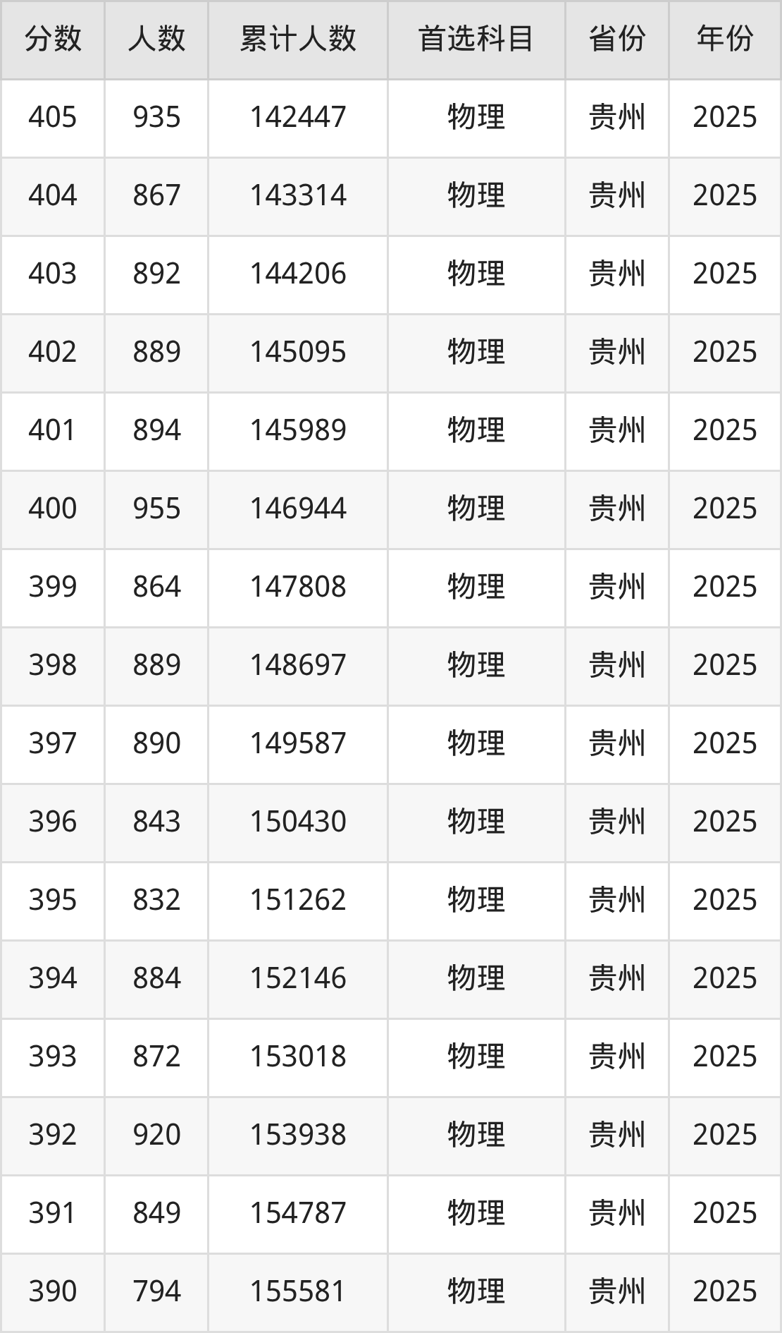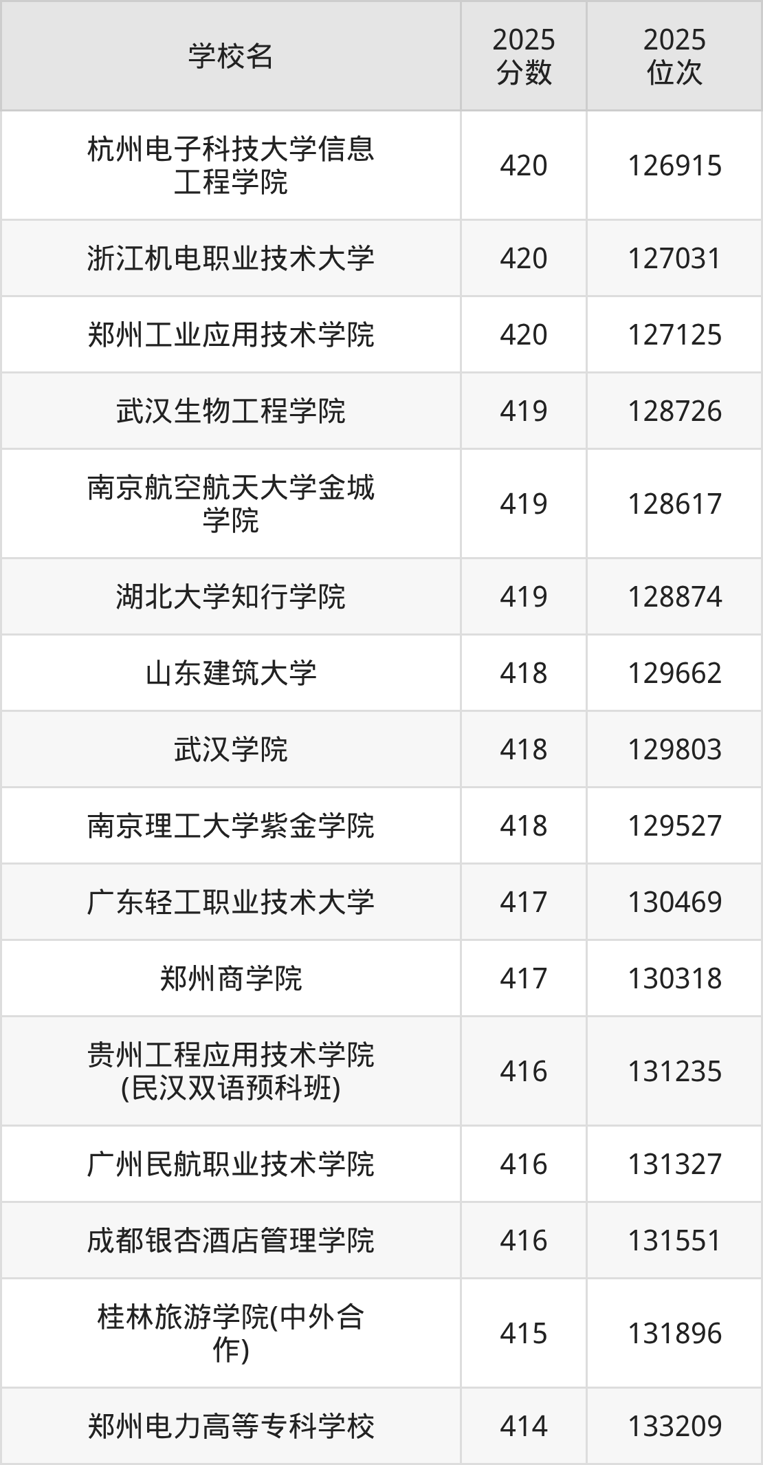 温馨提示:全国各省录取分数线不相同,本文以贵州省为例,为大家带来2025年录取分数线位于350到420分的理科大学名单汇总,并附上该分数段对应的位次排名区间,供查阅。
