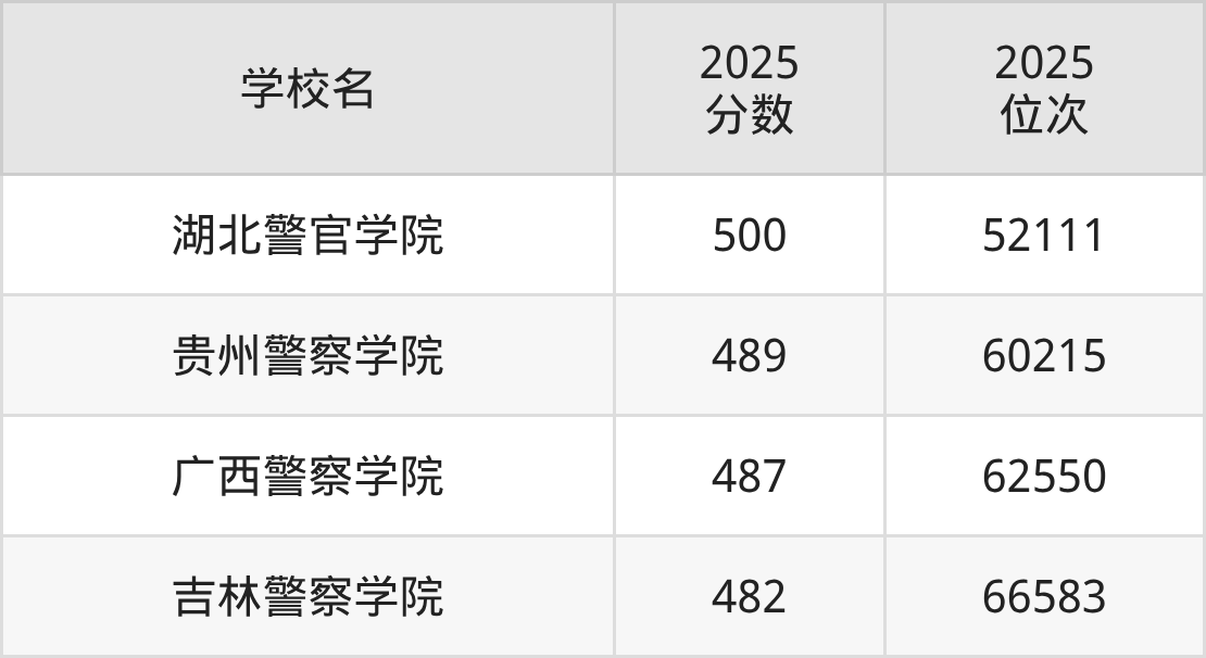 温馨提示:全国各省录取分数线不相同,本文以贵州省为例,为大家带来2025年录取分数线位于450到500分的公安警校名单汇总,并附上该分数段对应的位次排名区间,供查阅。