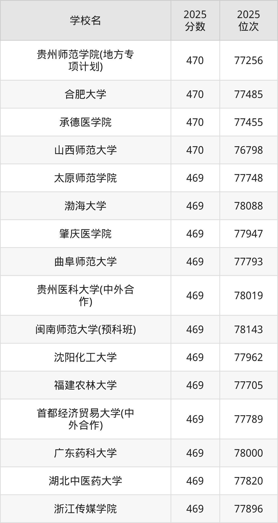 温馨提示:全国各省录取分数线不相同,本文以贵州省为例,为大家带来2025年录取分数线位于430到470分的公办本科大学名单汇总,并附上该分数段对应的位次排名区间,供查阅。