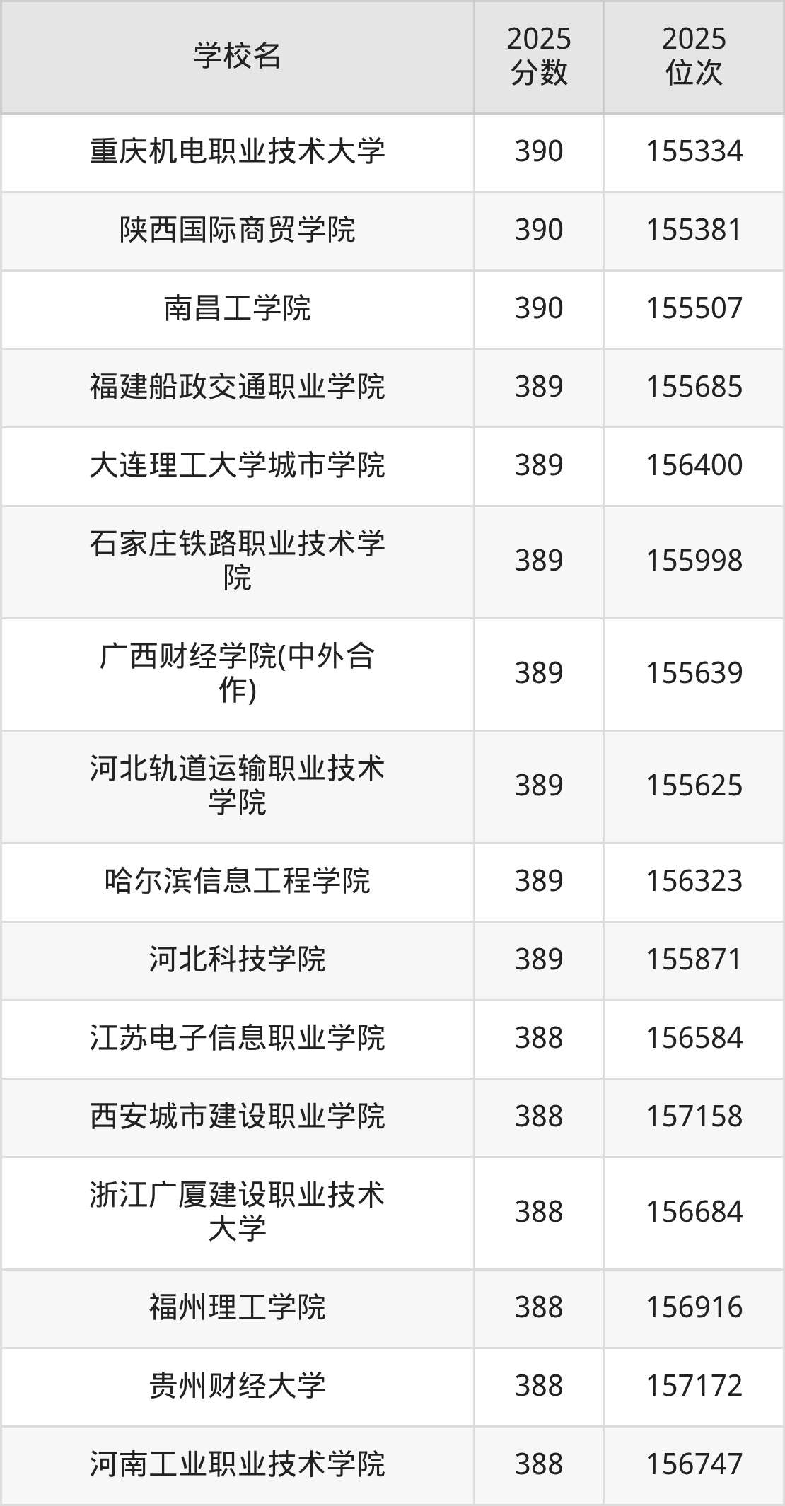| 长春金融高等专科学校 | 390 | 67138 |