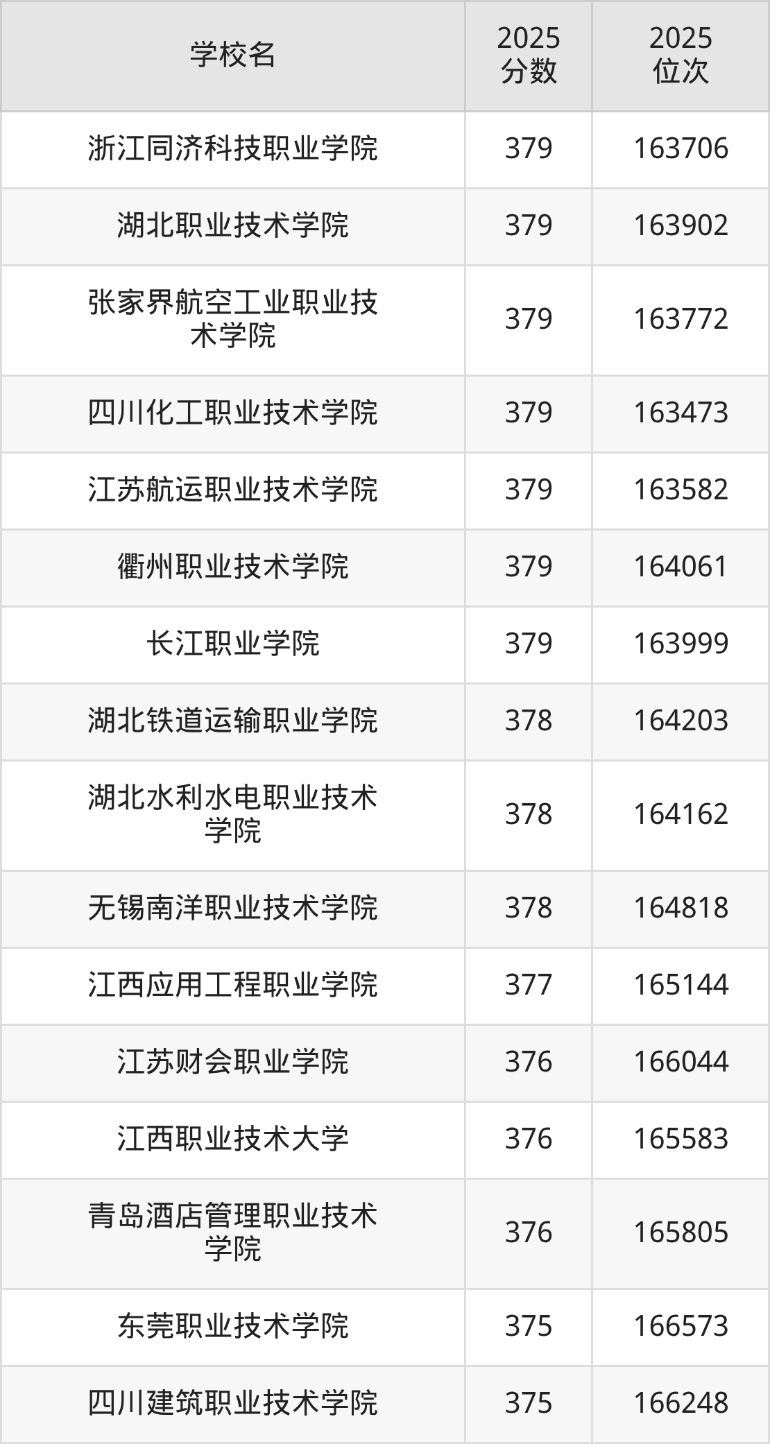 | 陕西航空职业技术学院 | 375 | 71955 |