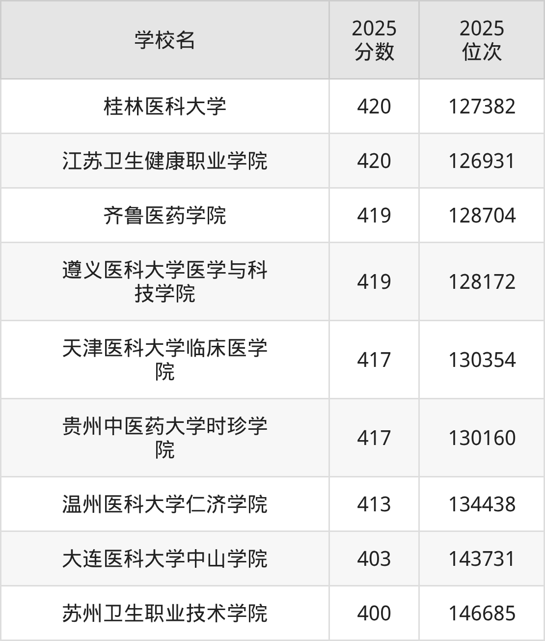 温馨提示:全国各省录取分数线不相同,本文以贵州省为例,为大家带来2025年录取分数线位于400到420分的医科大学名单汇总,并附上该分数段对应的位次排名区间,供查阅。