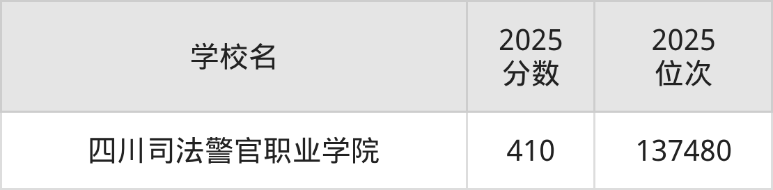物理类410到430分的大学中分数对应位次最低的是四川司法警官职业学院,2025年最低分410分,对应最低位次是137480名。