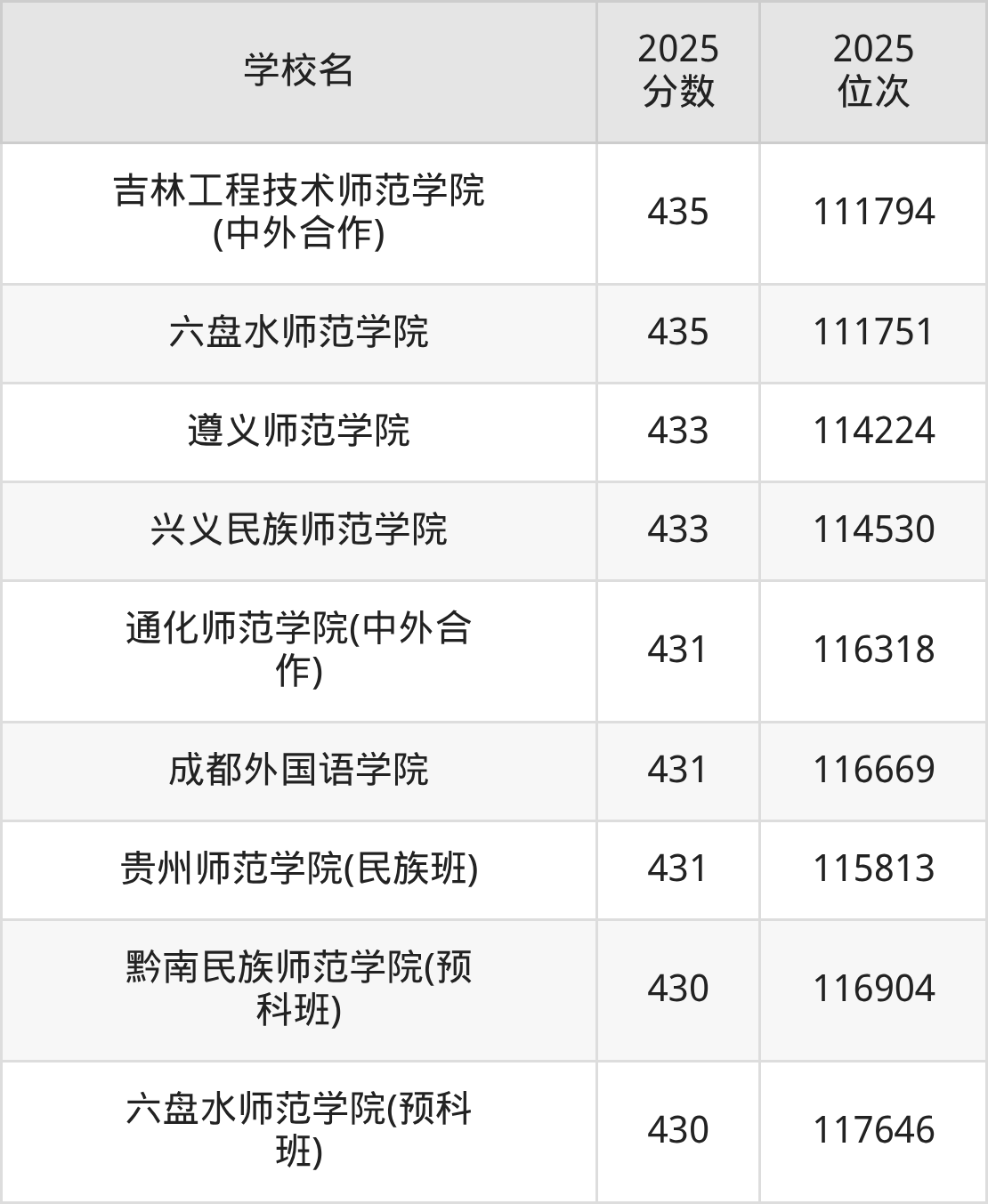 温馨提示:全国各省录取分数线不相同,本文以贵州省为例,为大家带来2025年录取分数线位于430到470分的文科大学名单汇总,并附上该分数段对应的位次排名区间,供查阅。