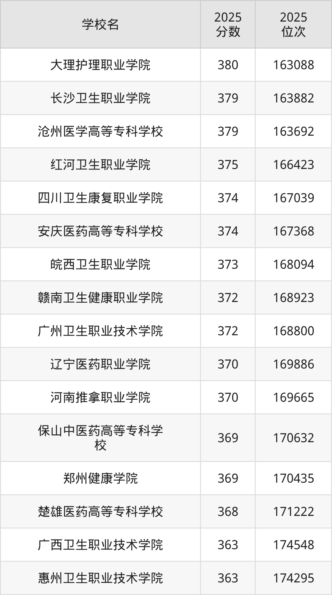 物理类350到380分的大学中分数对应位次最高的是大理护理职业学院,2025年最低分380分,对应最低位次是163088名;分数对应位次最低的是湖北中医药高等专科学校,2025年最低分350分,对应最低位次是181602名。