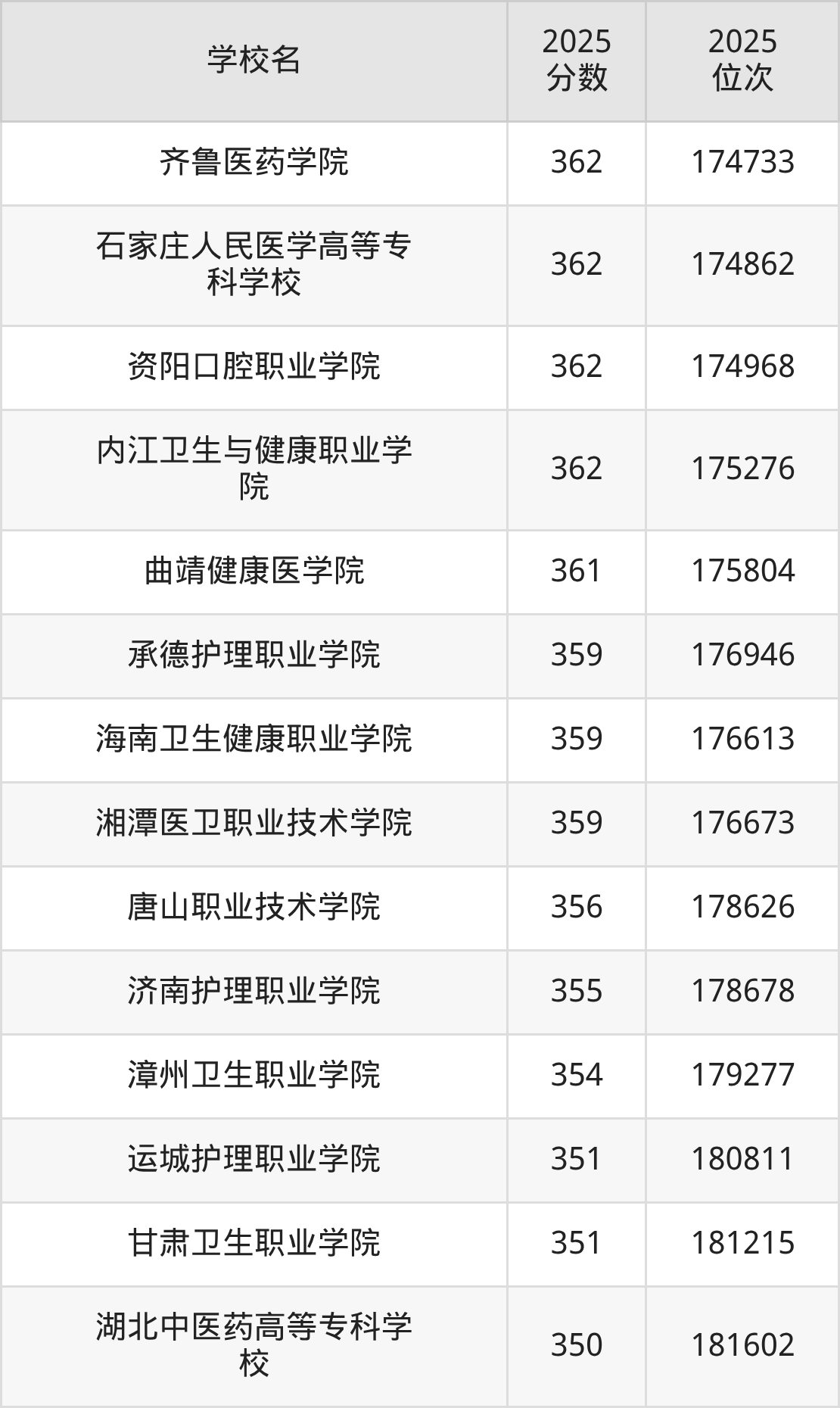 对于首选历史的同学来说,350到380分能上的医科大学中比较好的有石家庄人民医学高等专科学校(379分)、贵州护理职业技术学院(358分)、皖西卫生职业学院(374分)、黑龙江护理高等专科学校(374分)、潍坊护理职业学院(364分)等,这些大学均位居全国400强以内。