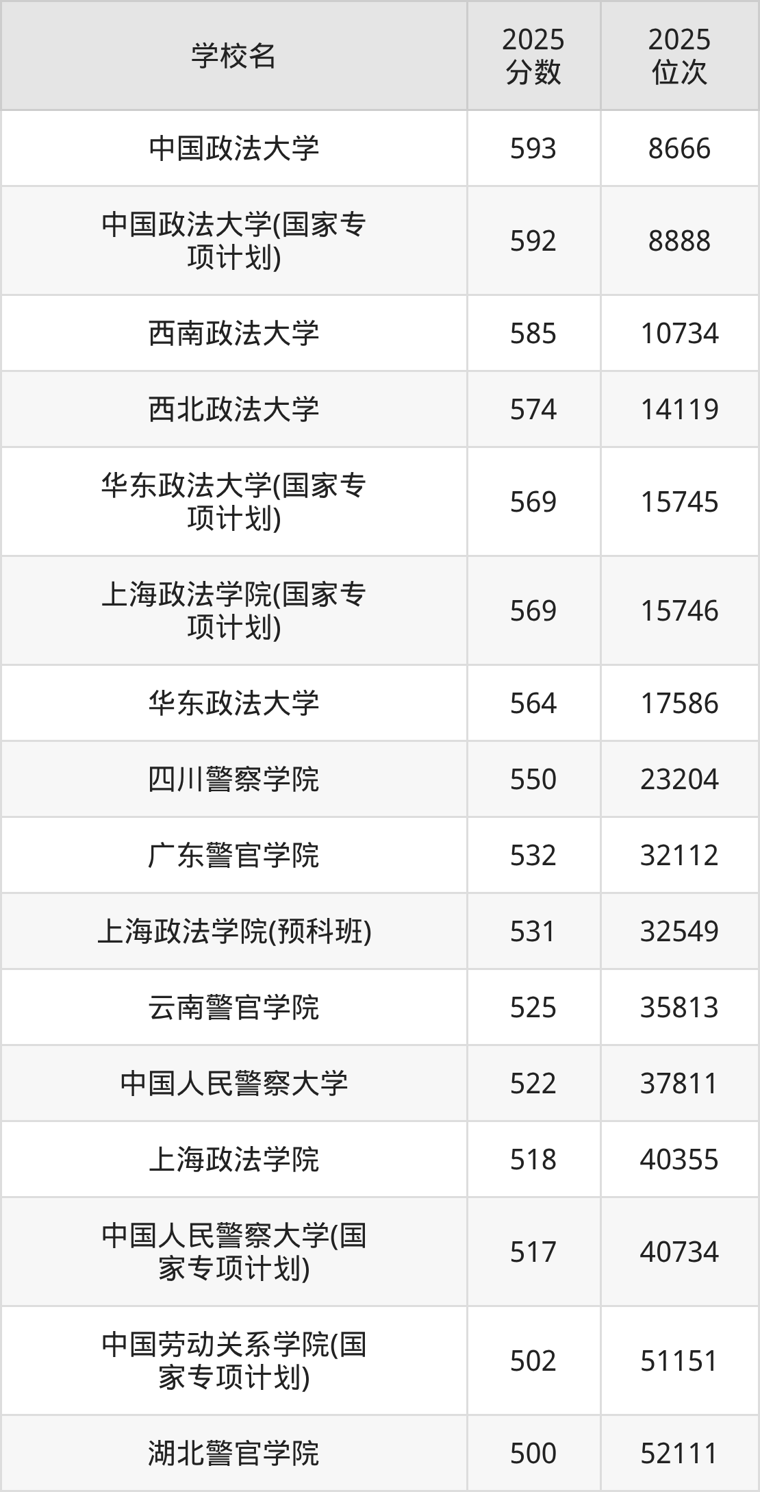 温馨提示:全国各省录取分数线不相同,本文以贵州省为例,为大家带来2025年录取分数线位于500到600分的政法大学名单汇总,并附上该分数段对应的位次排名区间,供查阅。