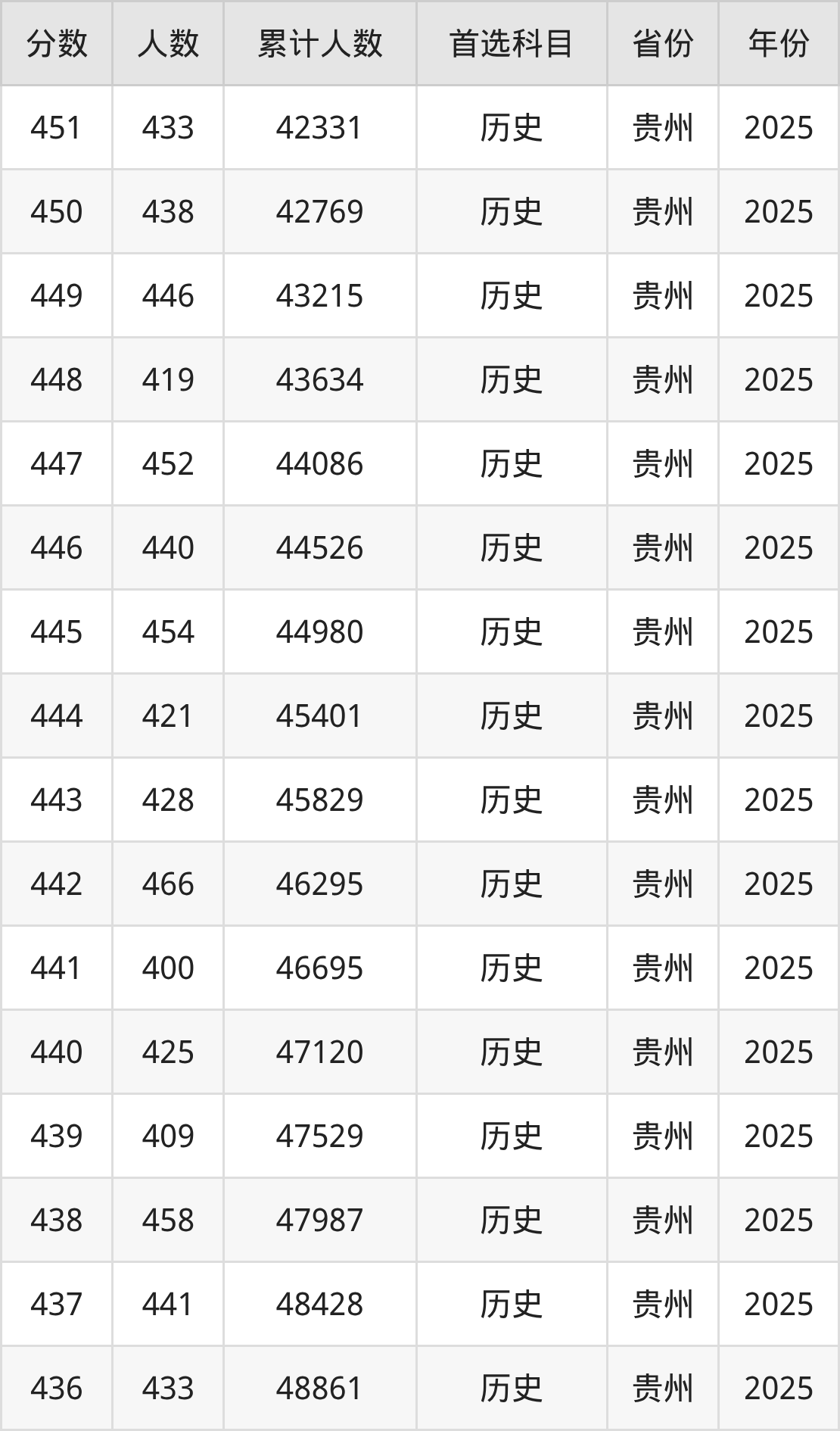历史类430到450分的位次排名:42332名~51478名