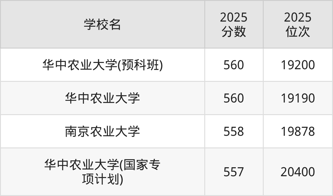 温馨提示:全国各省录取分数线不相同,本文以贵州省为例,为大家带来2025年录取分数线位于550到560分的农业大学名单汇总,并附上该分数段对应的位次排名区间,供查阅。