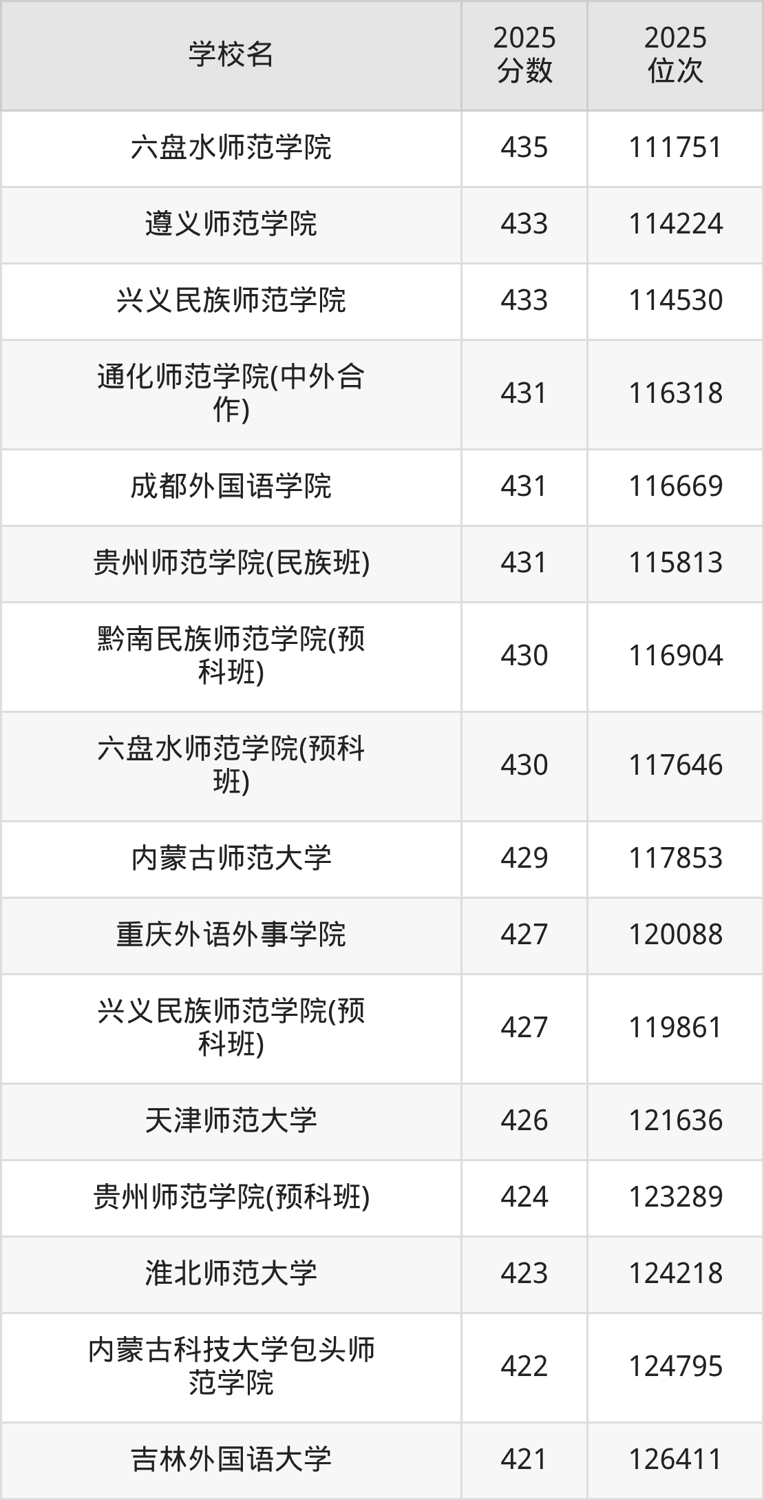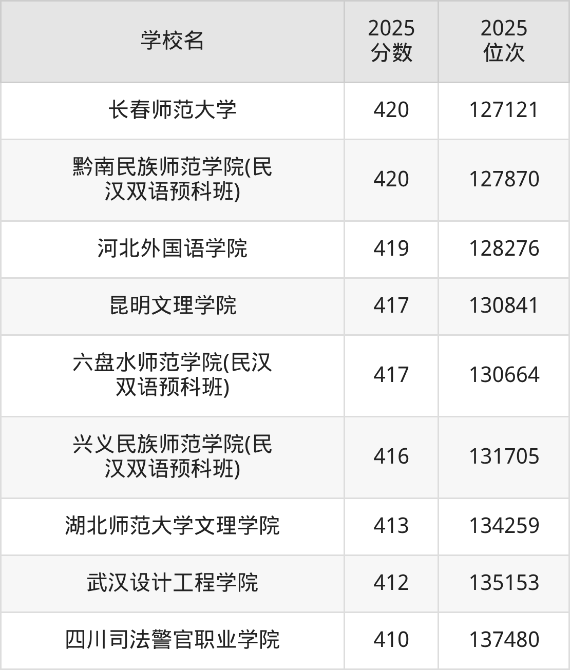 温馨提示:全国各省录取分数线不相同,本文以贵州省为例,为大家带来2025年录取分数线位于410到450分的文科大学名单汇总,并附上该分数段对应的位次排名区间,供查阅。