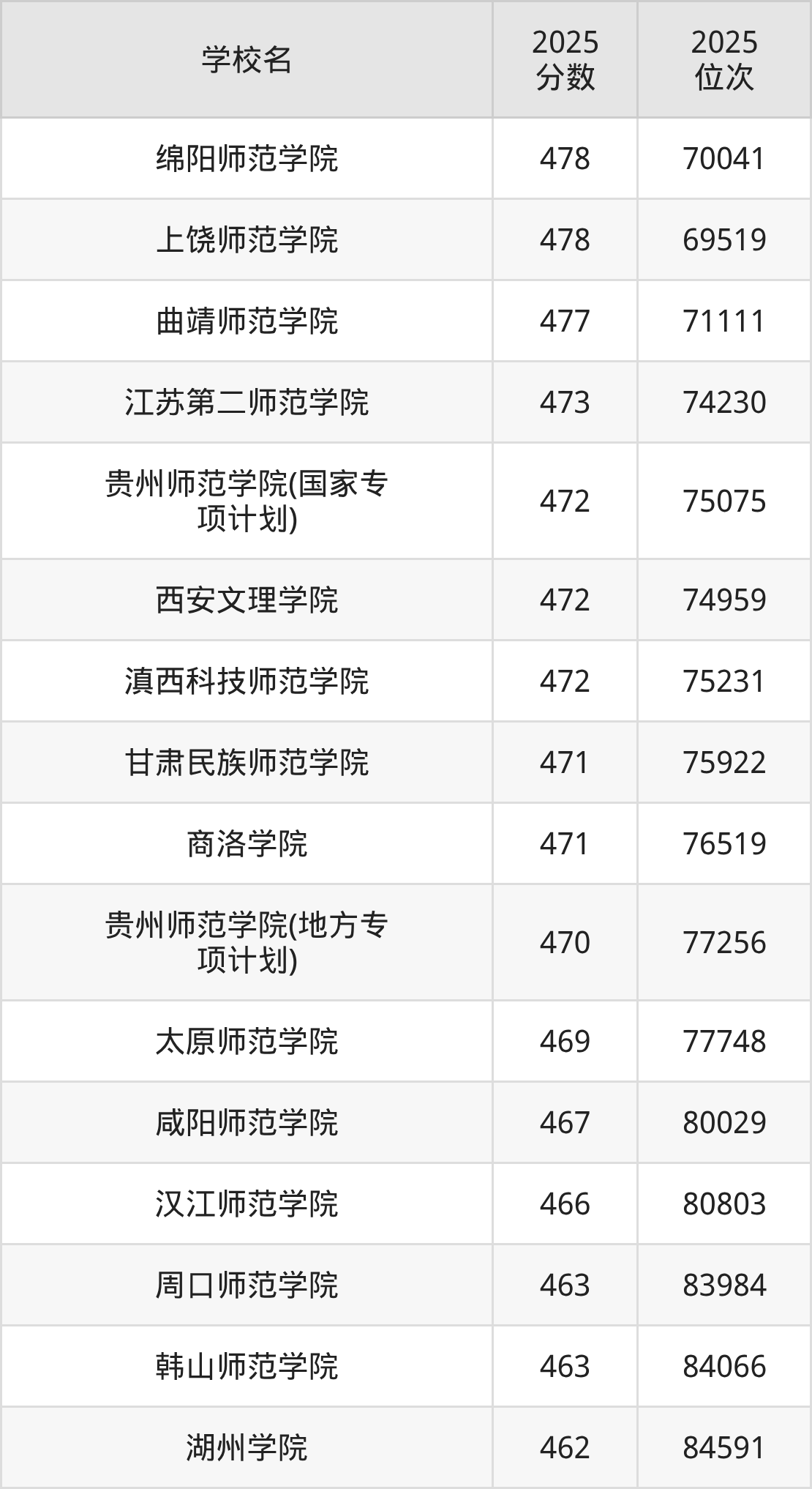 温馨提示:全国各省录取分数线不相同,本文以贵州省为例,为大家带来2025年录取分数线位于460到480分的二本师范大学名单汇总,并附上该分数段对应的位次排名区间,供查阅。