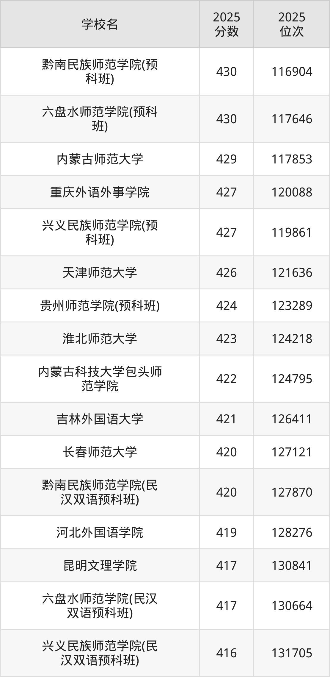 温馨提示:全国各省录取分数线不相同,本文以贵州省为例,为大家带来2025年录取分数线位于410到430分的文科大学名单汇总,并附上该分数段对应的位次排名区间,供查阅。