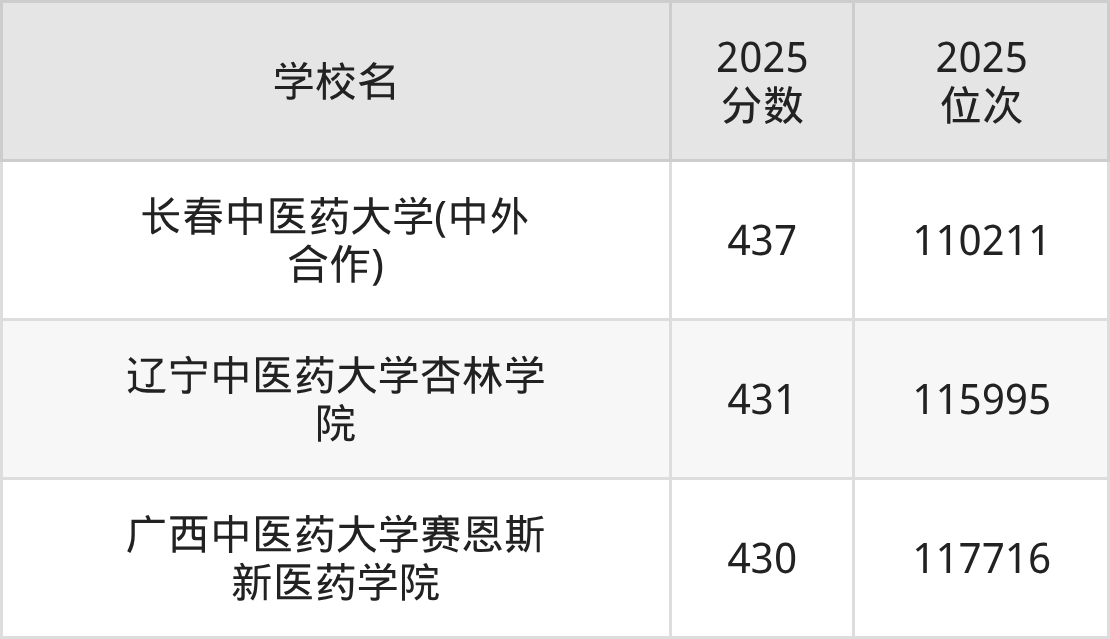 温馨提示:全国各省录取分数线不相同,本文以贵州省为例,为大家带来2025年录取分数线位于430到440分的中医药大学名单汇总,并附上该分数段对应的位次排名区间,供查阅。