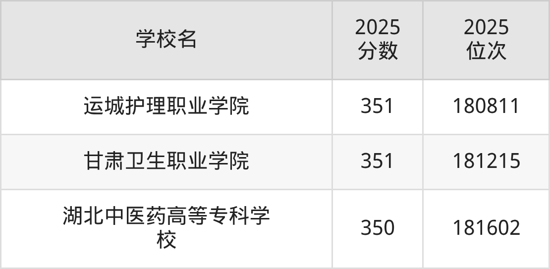 历史类350到400分的大学中分数对应位次最高的是运城护理职业学院,2025年最低分392分,对应最低位次是66492名;分数对应位次最低的是大庆医学高等专科学校,2025年最低分351分,对应最低位次是78360名。