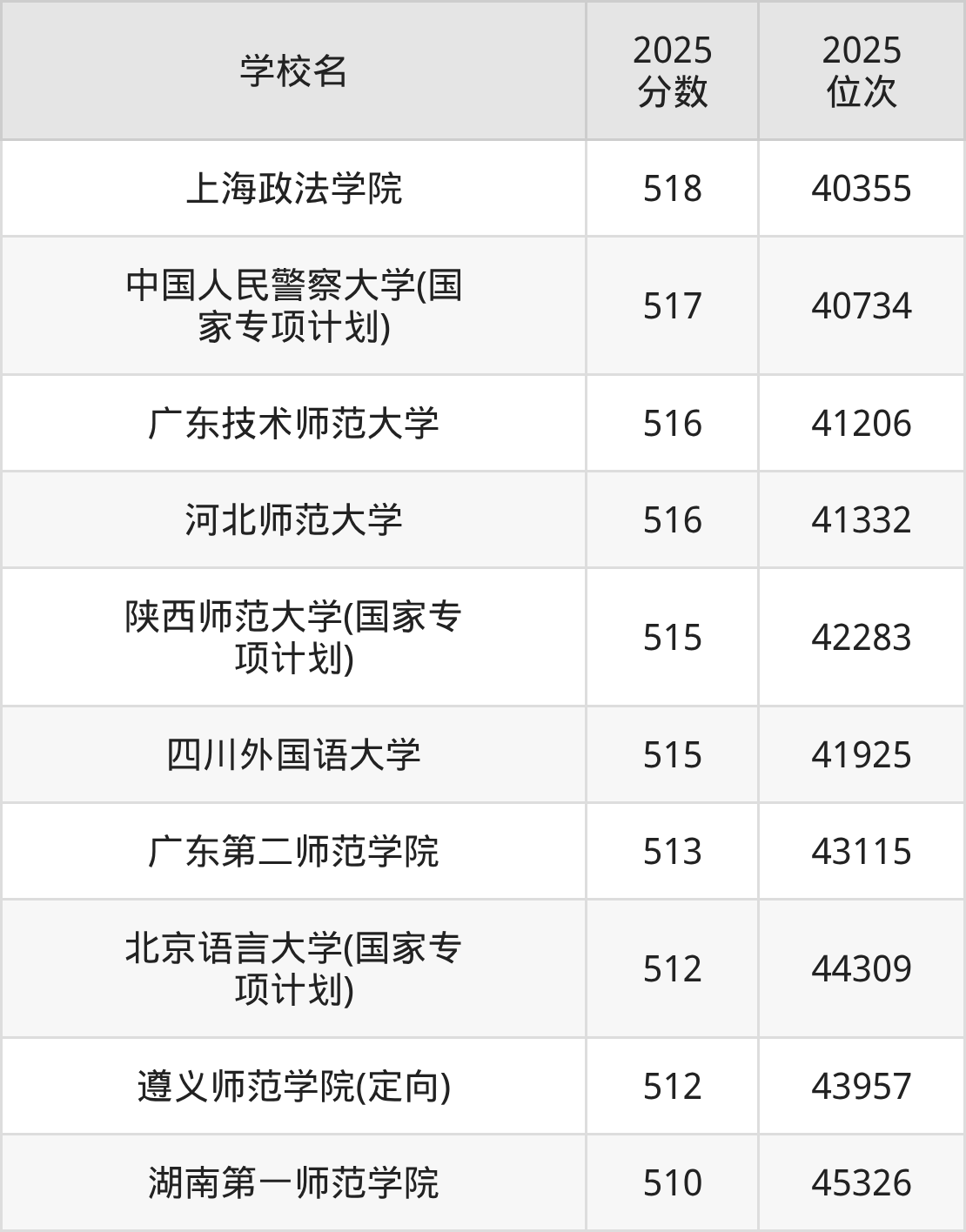 温馨提示:全国各省录取分数线不相同,本文以贵州省为例,为大家带来2025年录取分数线位于510到520分的文科大学名单汇总,并附上该分数段对应的位次排名区间,供查阅。