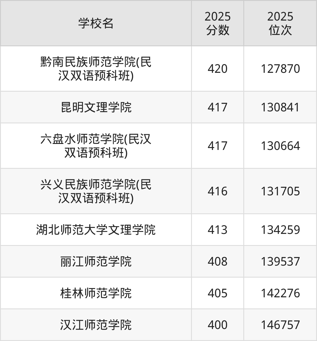 温馨提示:全国各省录取分数线不相同,本文以贵州省为例,为大家带来2025年录取分数线位于400到420分的二本师范大学名单汇总,并附上该分数段对应的位次排名区间,供查阅。