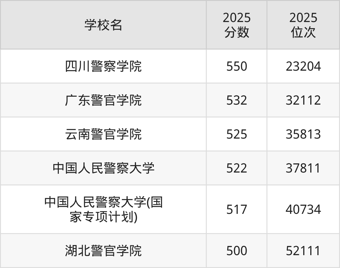 温馨提示:全国各省录取分数线不相同,本文以贵州省为例,为大家带来2025年录取分数线位于500到600分的公安警校名单汇总,并附上该分数段对应的位次排名区间,供查阅。