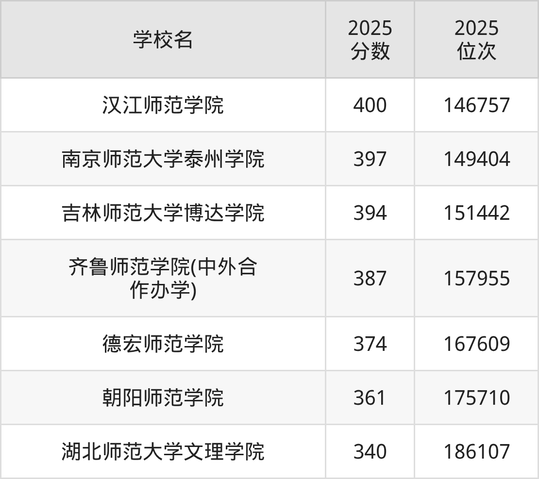 温馨提示:全国各省录取分数线不相同,本文以贵州省为例,为大家带来2025年录取分数线位于300到400分的二本师范大学名单汇总,并附上该分数段对应的位次排名区间,供查阅。