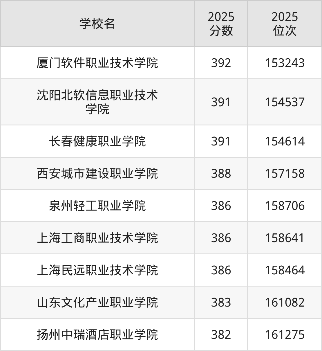 物理类380到400分的大学中分数对应位次最高的是厦门软件职业技术学院,2025年最低分392分,对应最低位次是153243名;分数对应位次最低的是扬州中瑞酒店职业学院,2025年最低分382分,对应最低位次是161275名。