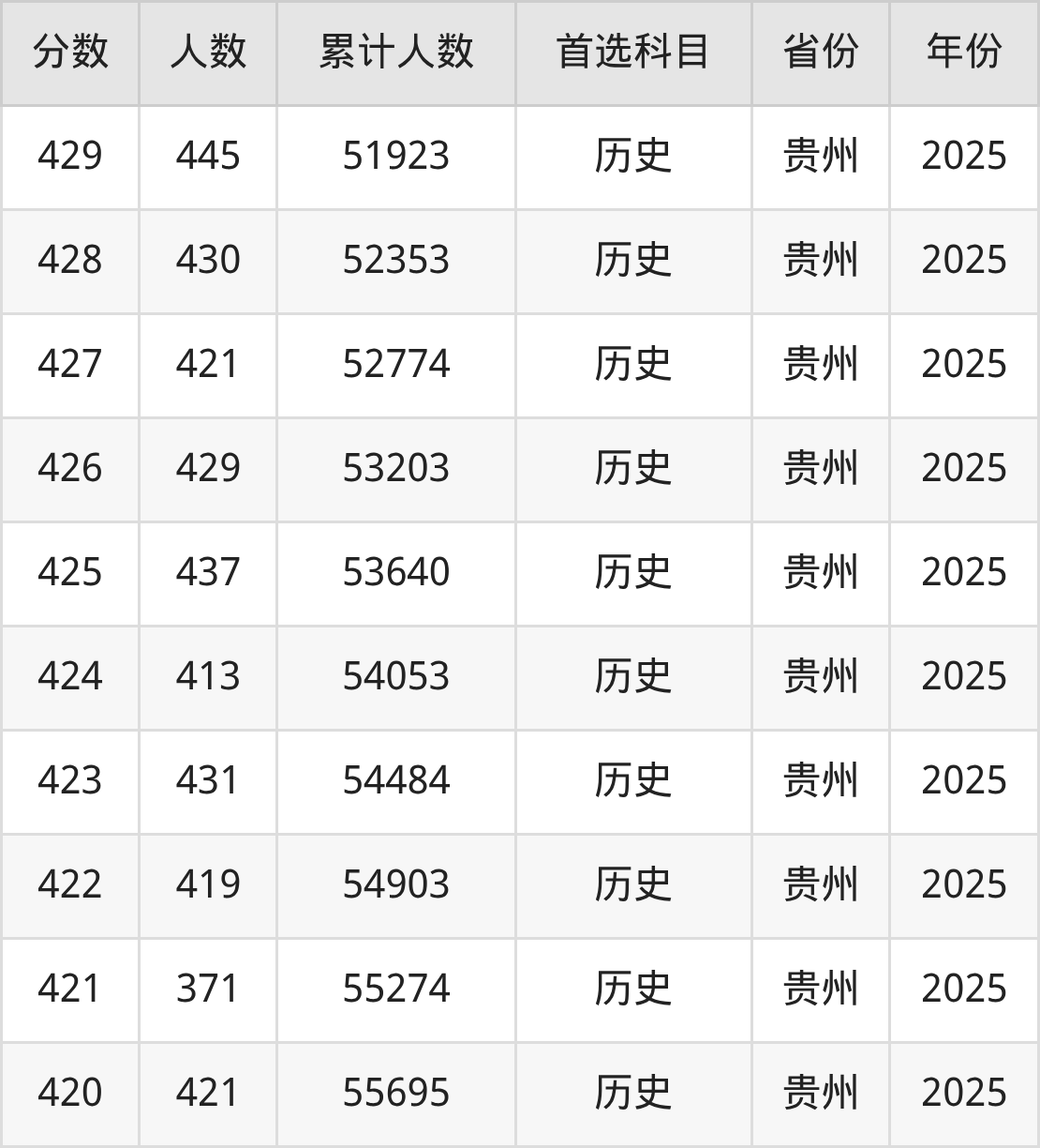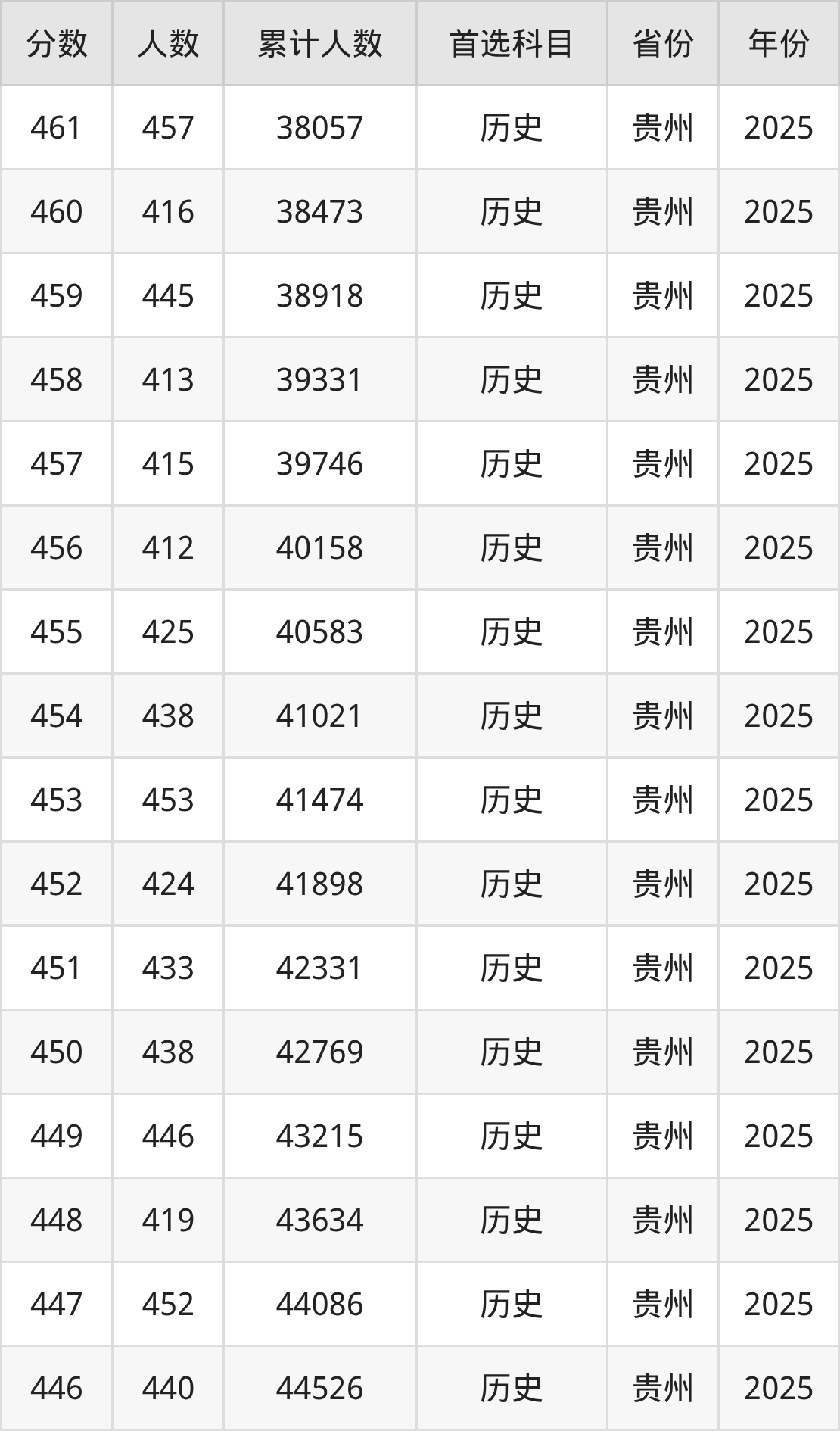 历史类420到460分的位次排名:38058名~55695名