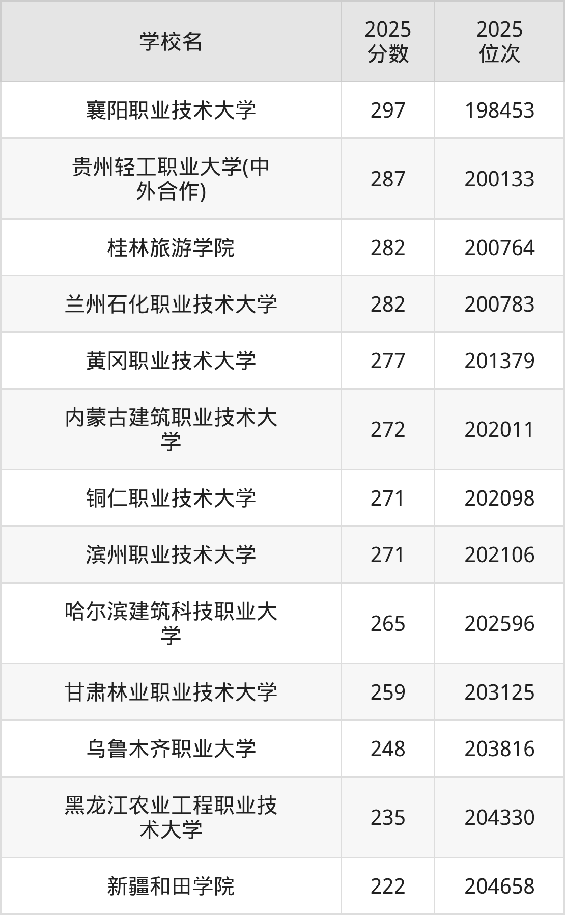 录取分数线的波动较大,下面圆梦小编为大家带来了2025年200到300分对应的位次排名区间,建议2026年位于该位次范围内的考生参考上文所整理的学校(本文仅针对贵州省)。