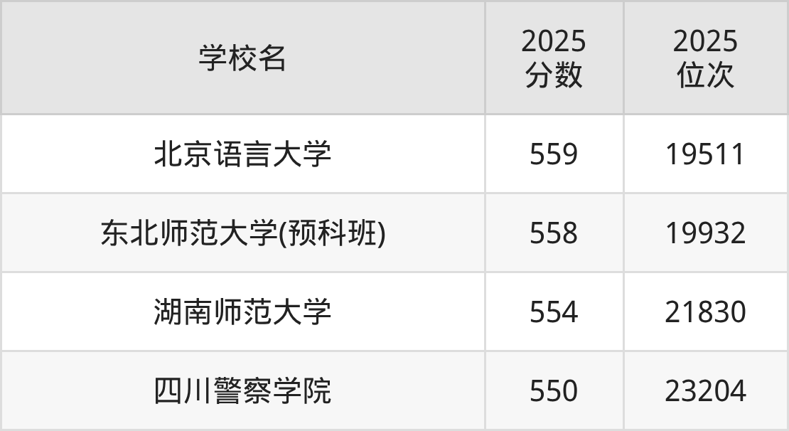 物理类550到560分的大学中分数对应位次最高的是北京语言大学,2025年最低分559分,对应最低位次是19511名;分数对应位次最低的是四川警察学院,2025年最低分550分,对应最低位次是23204名。