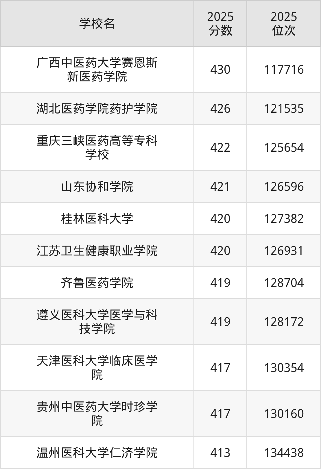 温馨提示:全国各省录取分数线不相同,本文以贵州省为例,为大家带来2025年录取分数线位于410到430分的医科大学名单汇总,并附上该分数段对应的位次排名区间,供查阅。
