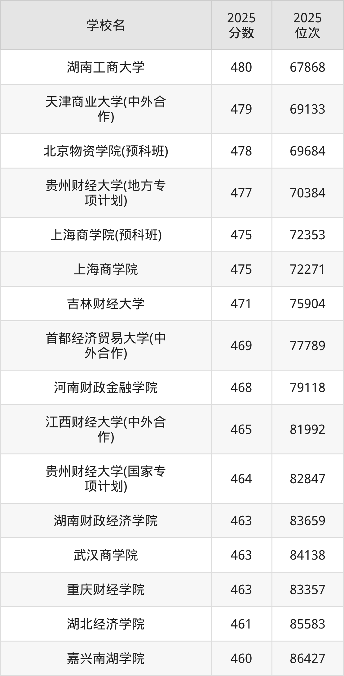 温馨提示:全国各省录取分数线不相同,本文以贵州省为例,为大家带来2025年录取分数线位于460到480分的财经大学名单汇总,并附上该分数段对应的位次排名区间,供查阅。