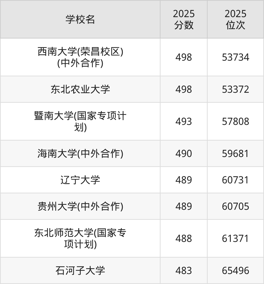 物理类480到500分的大学中分数对应位次最高的是西南大学(荣昌校区)(中外合作),2025年最低分498分,对应最低位次是53734名;分数对应位次最低的是石河子大学,2025年最低分483分,对应最低位次是65496名。