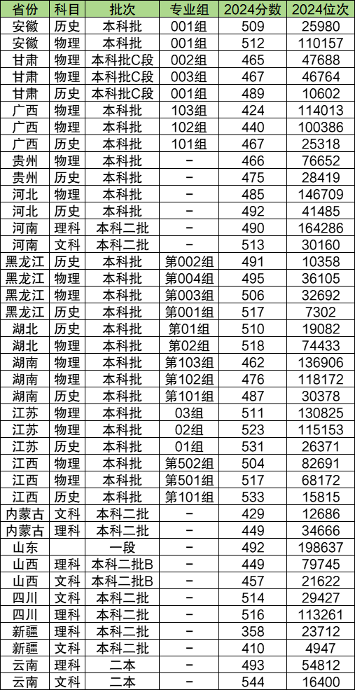 安徽509分、甘肃465分、广西424分、贵州466分、河北485分、河南490分、黑龙江491分、湖北510分、江苏511分、内蒙古429分、山东492分、山西449分等。
