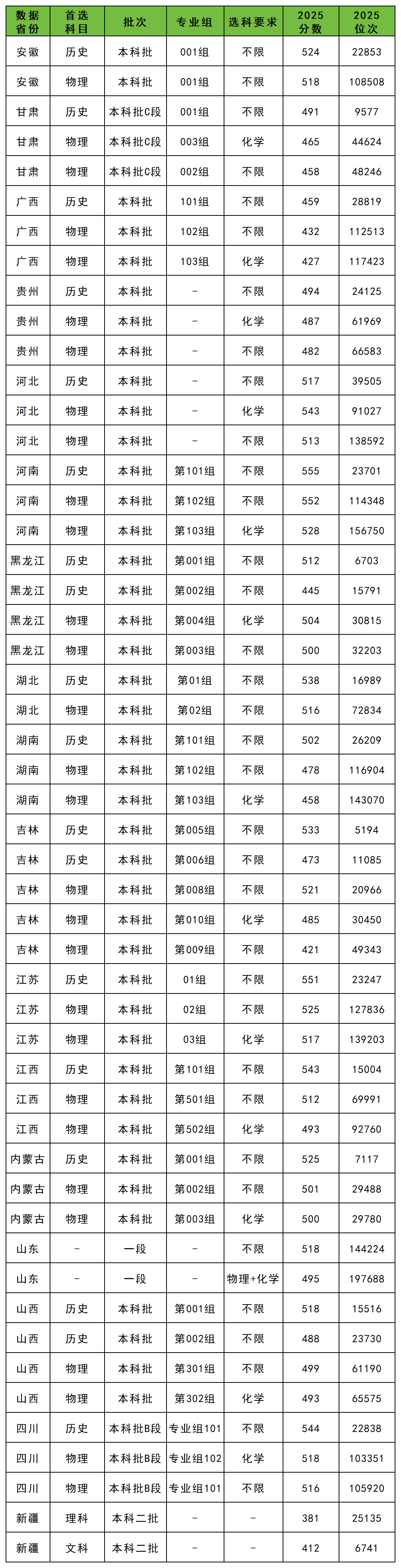 | 批次 | 选科要求 | 性别 | 最低分 |