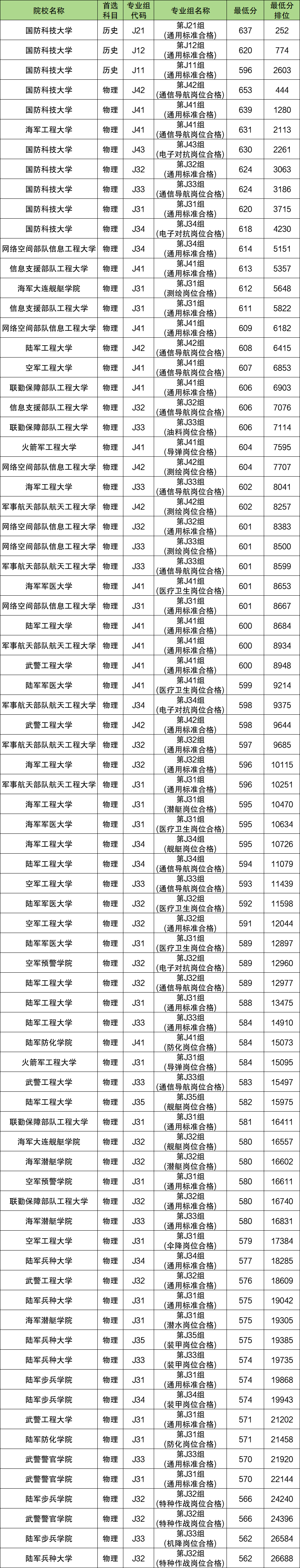 军、警类平行志愿中,江西提前批军校最低录取分数线:历史类596分、物理类562分,各院校最低分如下:
