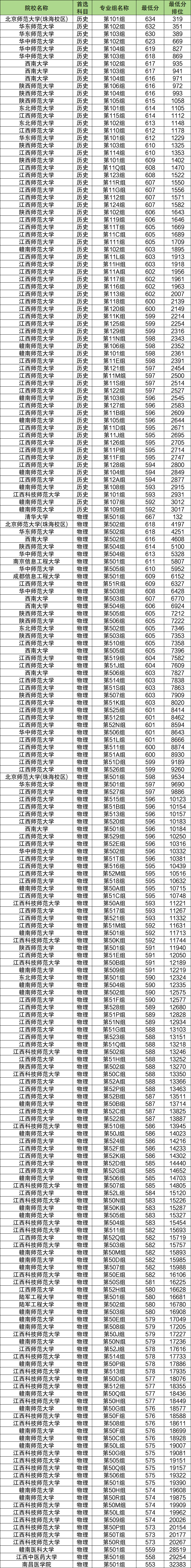 历史类最高分、最低分对应的学校依次是:北京师范大学(珠海校区)第101组(634分)、赣南师范大学第107/109组(592分);