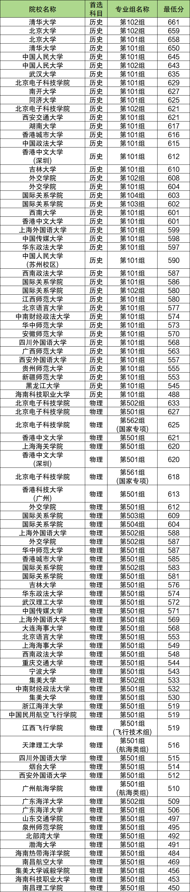 历史类最高分、最低分对应的学校依次是:清华大学第102组(661分)、海南科技职业大学第101组(488分);