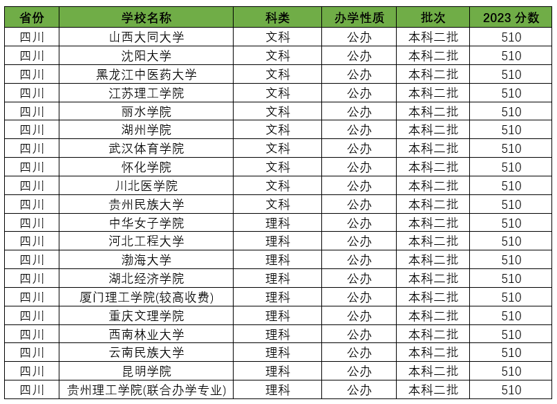 四川510分能报考的大学都是公办性质大学,但都是在本科二批次录取,文科510分录取大学大多都是地方性学院,如丽水学院、湖州学院、怀化学院等,另外还有两所医药类大学,分别是黑龙江中医药大学和川北医学院。理科录取的理工类和综合大学多一些,如河北工程大学、渤海大学、重庆文理学院等。
