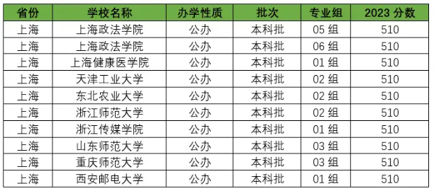 2023年在上海510分能报考的大学都是公办性质的大学,从下表数据来看,师范类大学多一些,在510分录取的有浙江师范大学、山东师范大学、重庆师范大学,其中浙江师范大学在校友会2024年师范类大学排名中排在第11名,实力也不可小觑。在这个分数录取的还有双一流大学天津工业大学和211大学东北农业大学,都是很不错的大学。