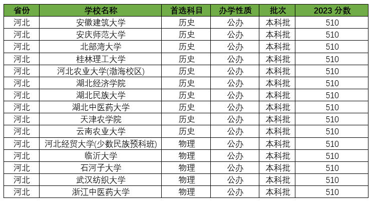 高考510分在实行新高考3+1+2的河北还是有不少大学可以选择的,从录取数据来看,历史组录取的大学相对物理组较多一些,如安徽建筑大学、桂林理工大学、河北农业大学(渤海校区)等,这些大学都属于省重点大学,拥有保研资格。