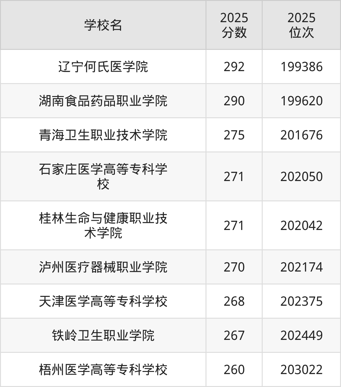 物理类260到300分的大学中分数对应位次最高的是辽宁何氏医学院,2025年最低分292分,对应最低位次是199386名;分数对应位次最低的是梧州医学高等专科学校,2025年最低分260分,对应最低位次是203022名。