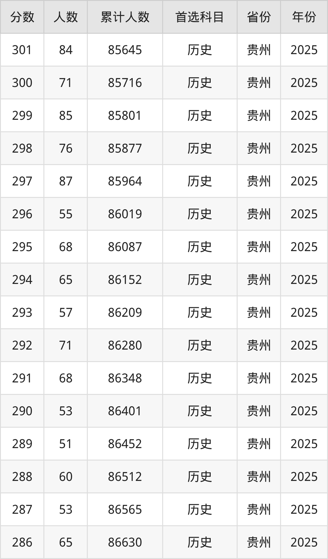 历史类260到300分的位次排名:85646名~87655名