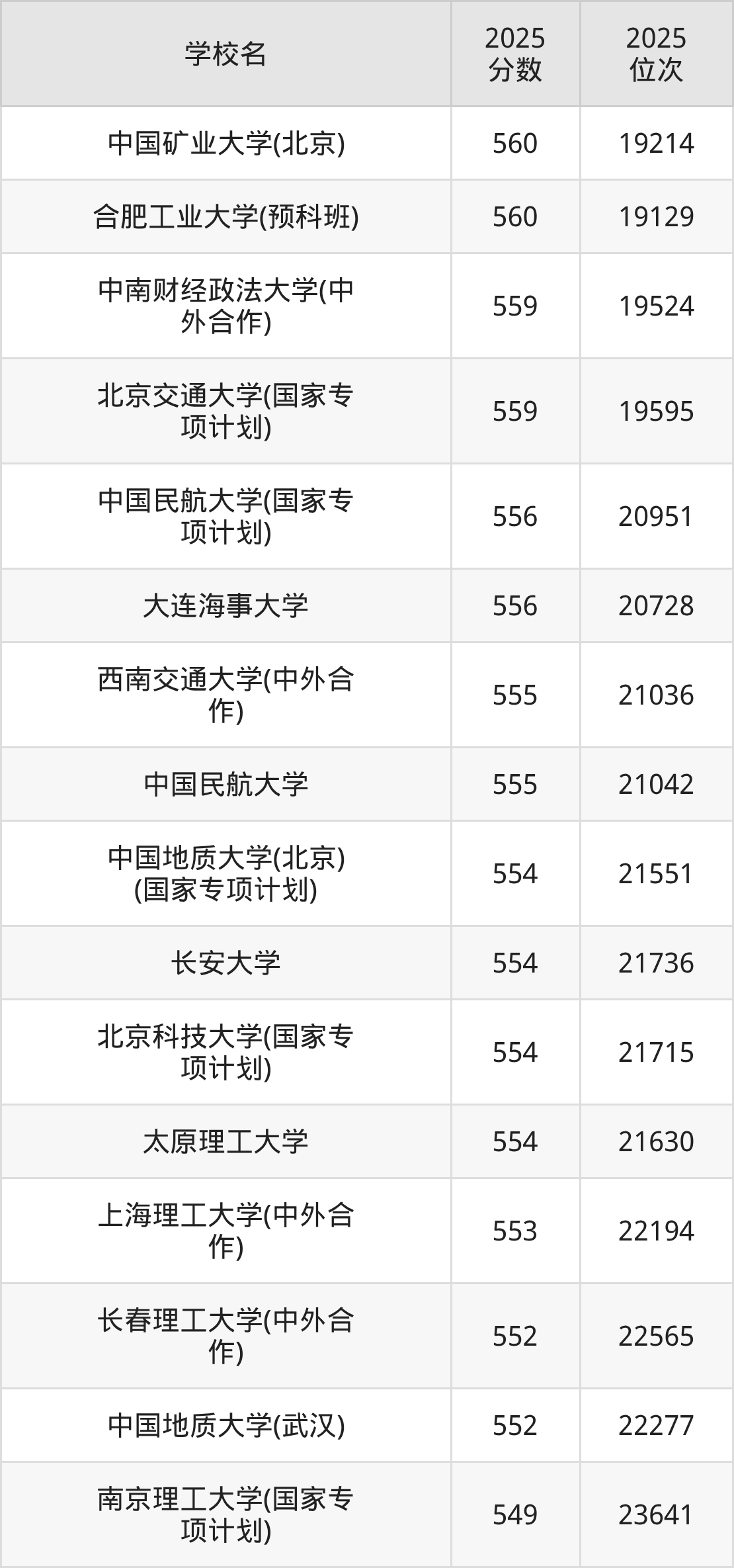 物理类540到560分的大学中分数对应位次最高的是中国矿业大学(北京),2025年最低分560分,对应最低位次是19214名;分数对应位次最低的是中国地质大学(武汉)(国家专项计划),2025年最低分541分,对应最低位次是27500名。