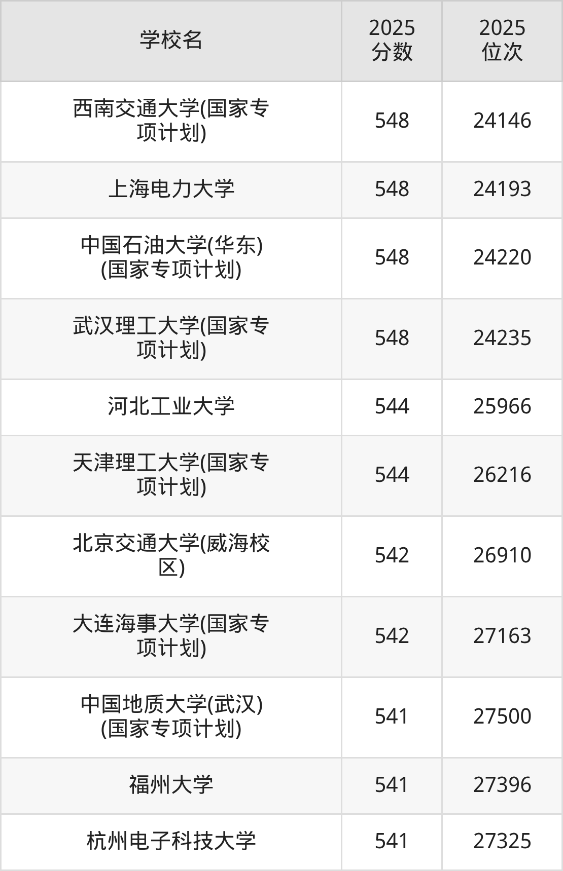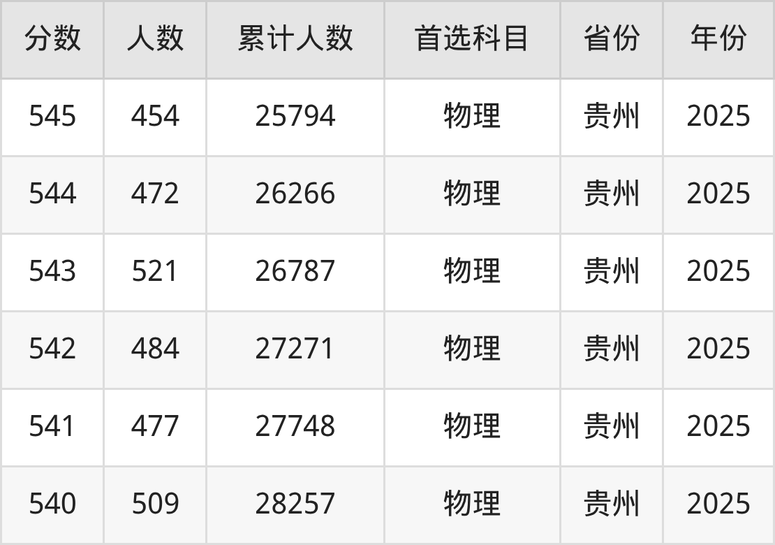 温馨提示:全国各省录取分数线不相同,本文以贵州省为例,为大家带来2025年录取分数线位于540到560分的理科大学名单汇总,并附上该分数段对应的位次排名区间,供查阅。