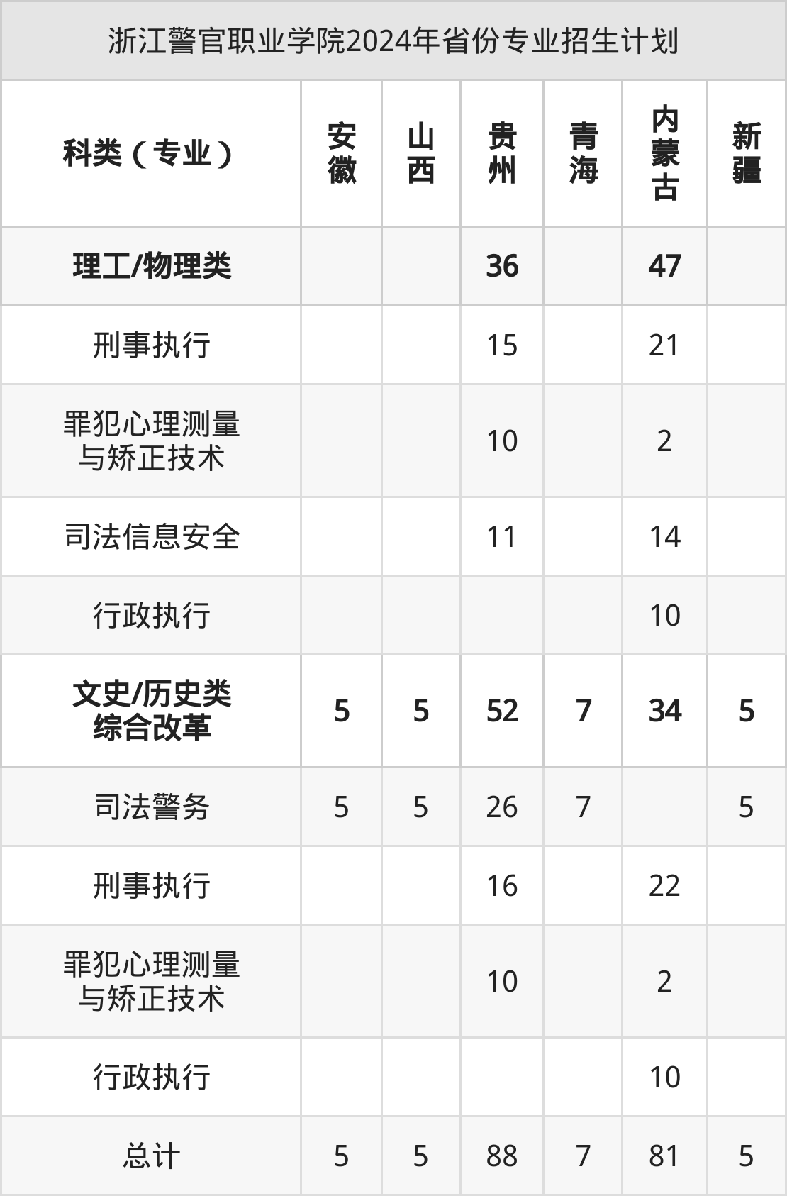 2024年浙江警官职业学院计划招收专科生191人,其中司法信息安全专业25人,行政执行专业20人,司法警务专业48人,刑事执行专业74人,罪犯心理测量与矫正技术专业24人。