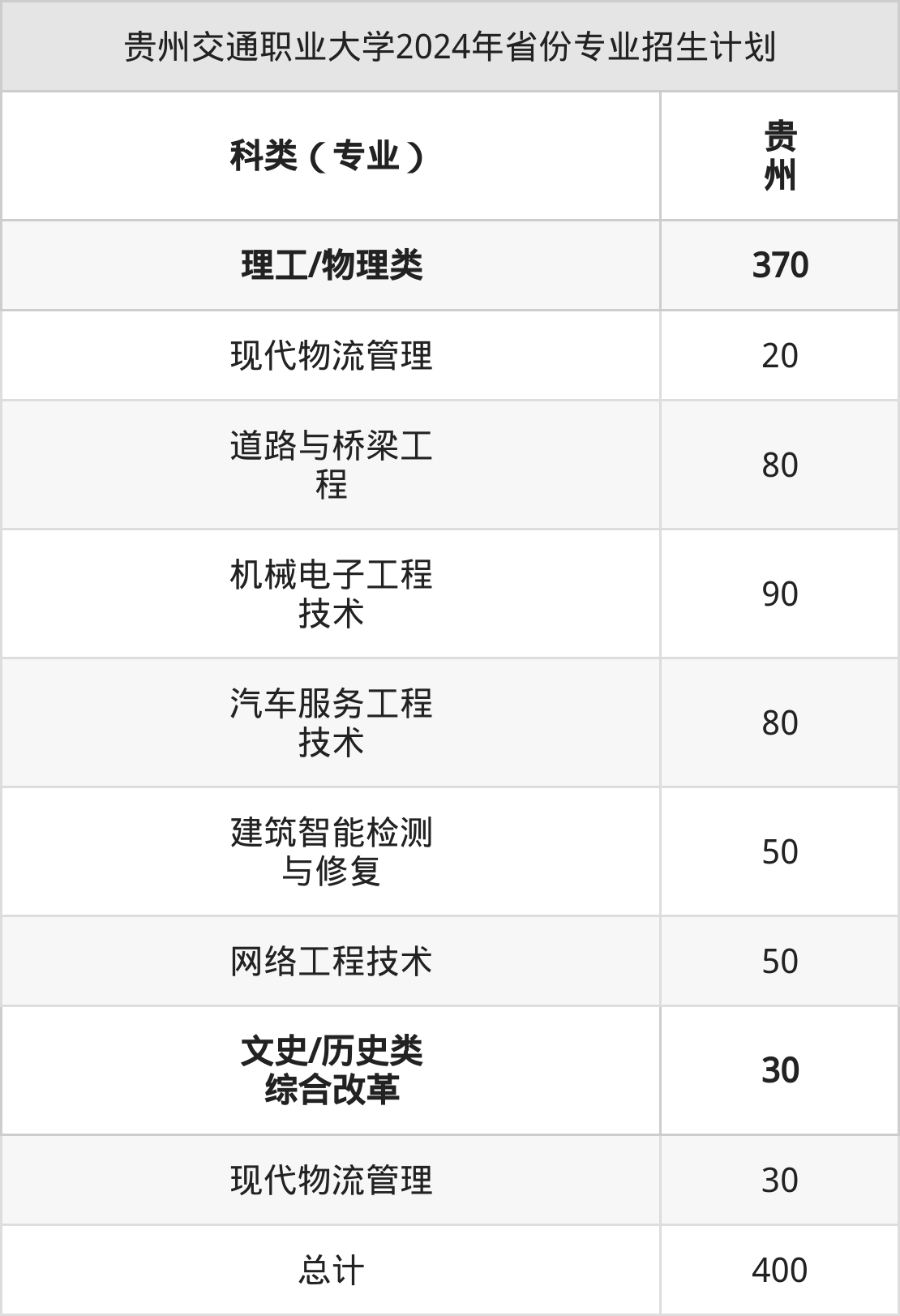 2024年贵州交通职业大学计划招收本科生400人,其中现代物流管理专业50人,道路与桥梁工程专业80人,机械电子工程技术专业90人,汽车服务工程技术专业80人,建筑智能检测与修复专业50人等。