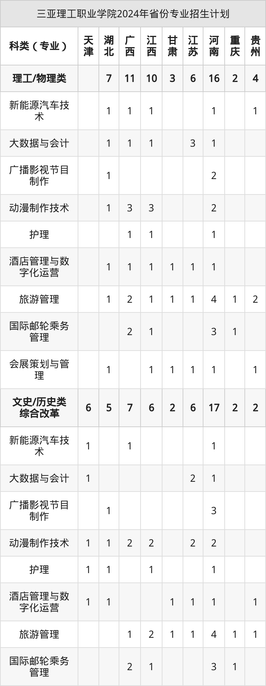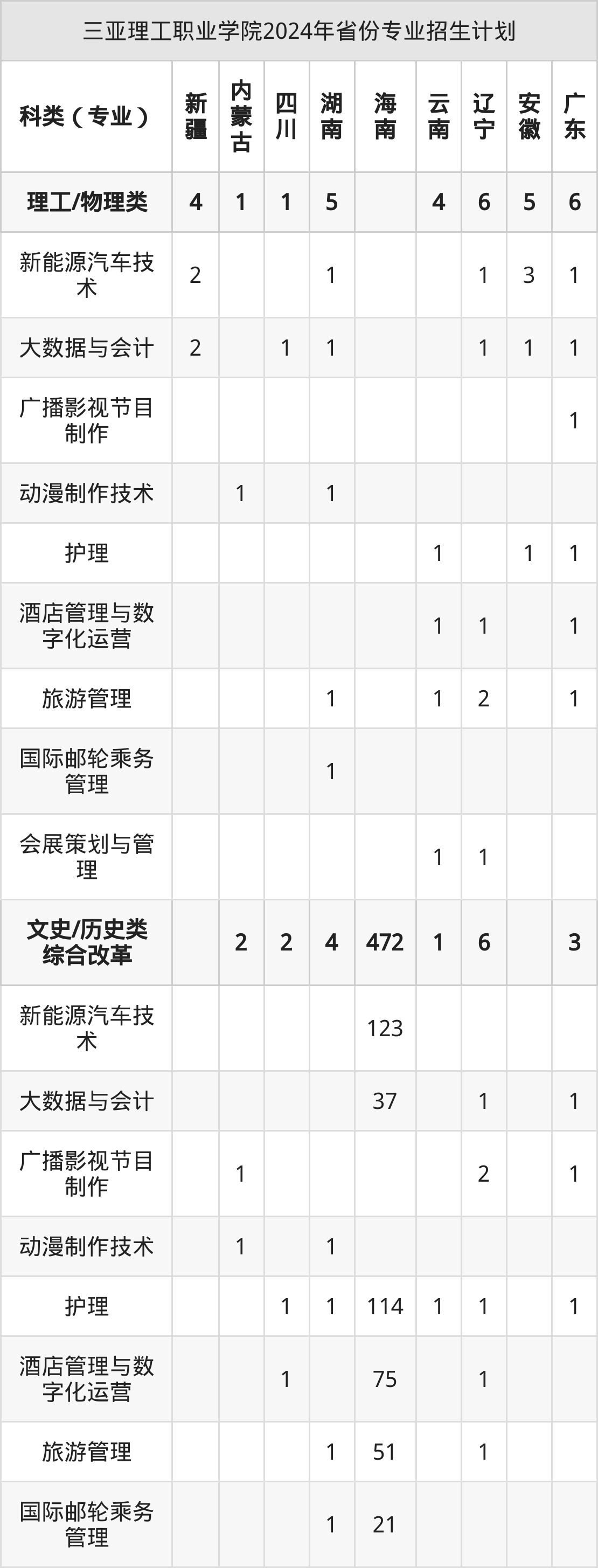 而各省份的招生计划数为广东9人,天津6人,广西18人,四川3人,海南472人等。