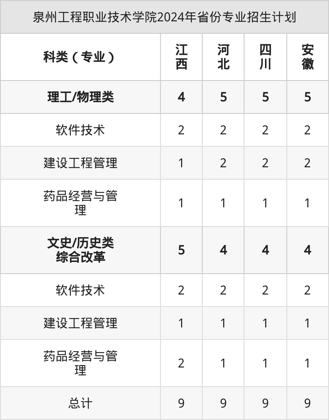 2024年泉州工程职业技术学院计划招收专科生36人,其中软件技术专业16人,建设工程管理专业11人,药品经营与管理专业9人。