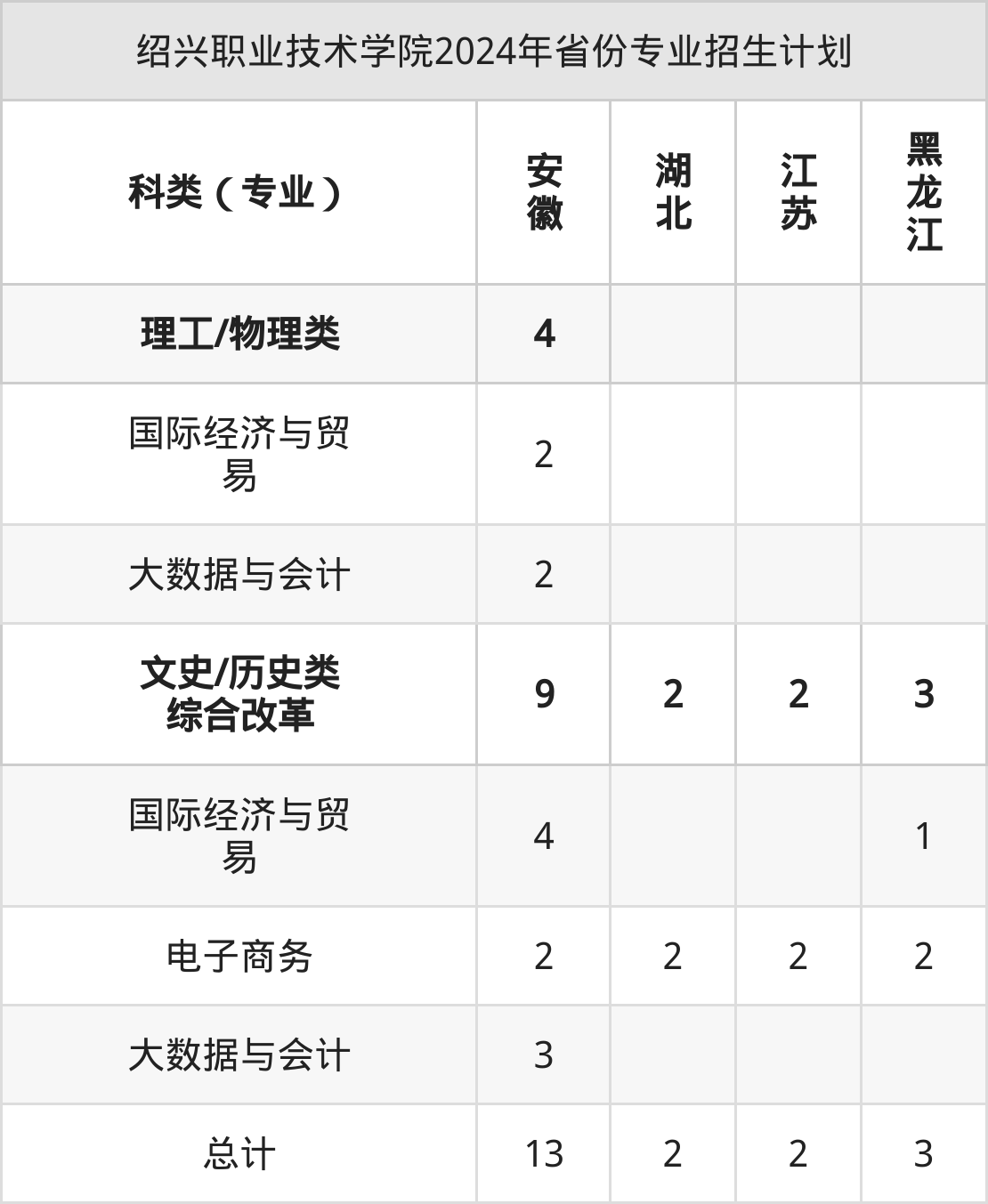 2024年绍兴职业技术学院计划招收专科生20人,其中国际经济与贸易专业7人,电子商务专业8人,大数据与会计专业5人。