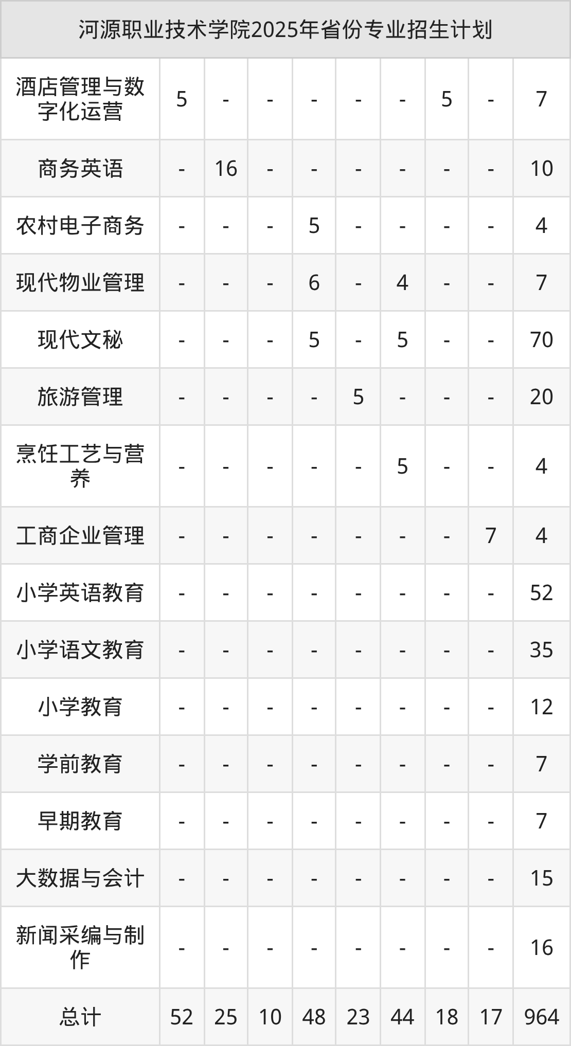 而各省份的招生计划数为河南52人,福建10人,云南48人,湖南44人,广东964人等。
