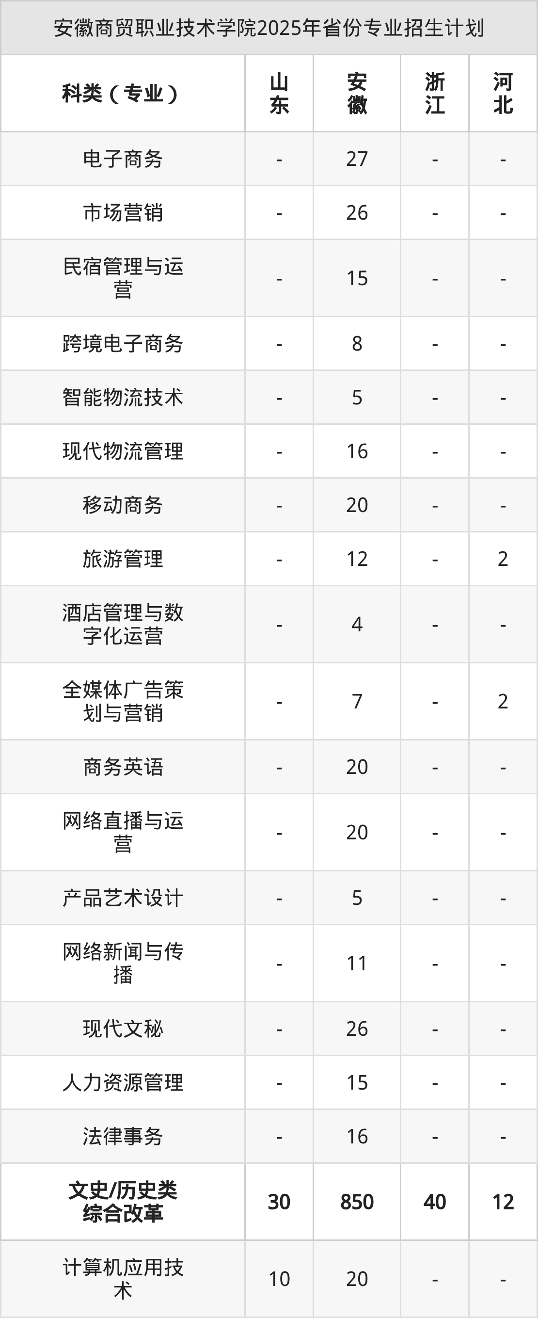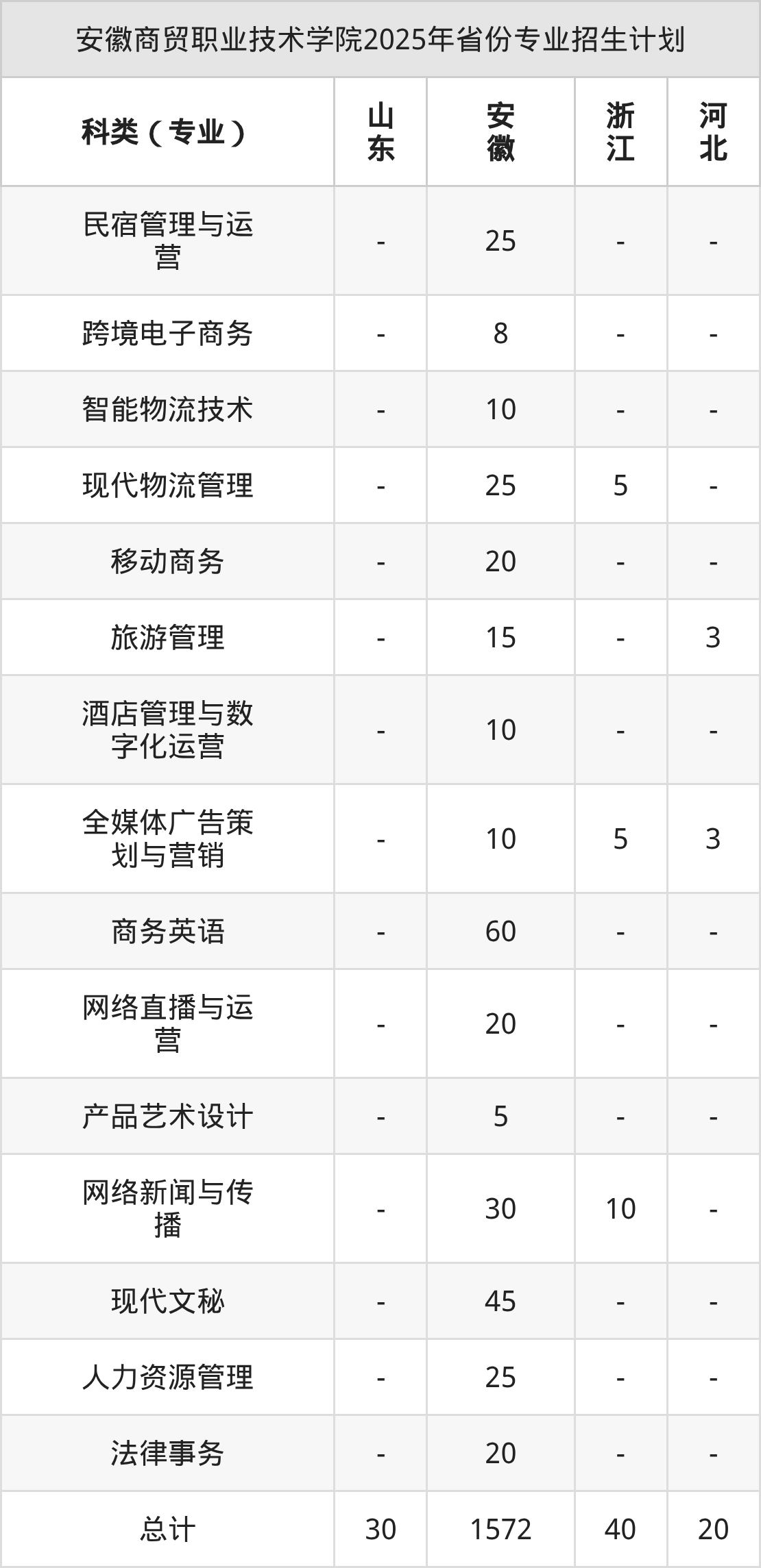 而各省份的招生计划数为山东30人,安徽1572人,浙江40人,河北20人。
